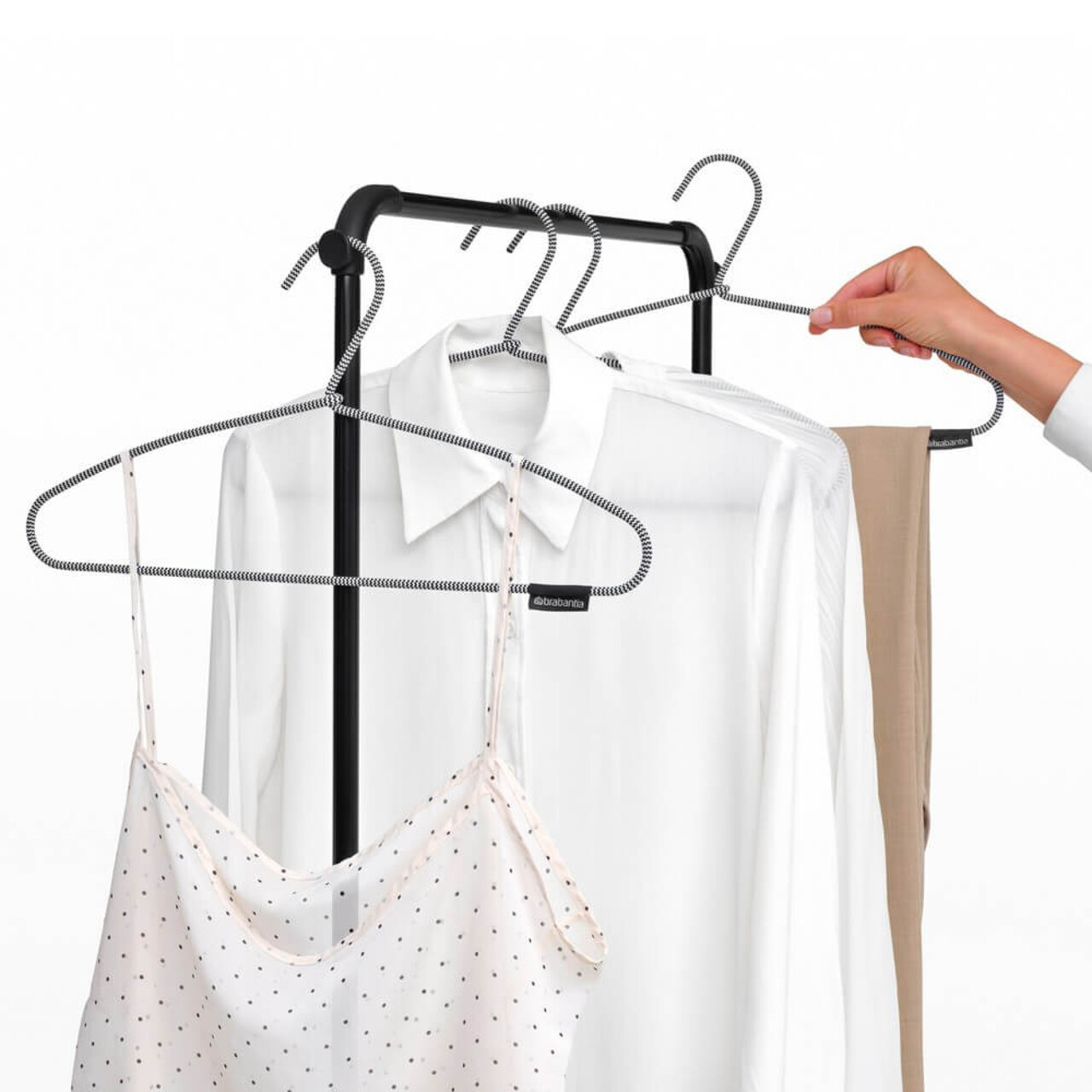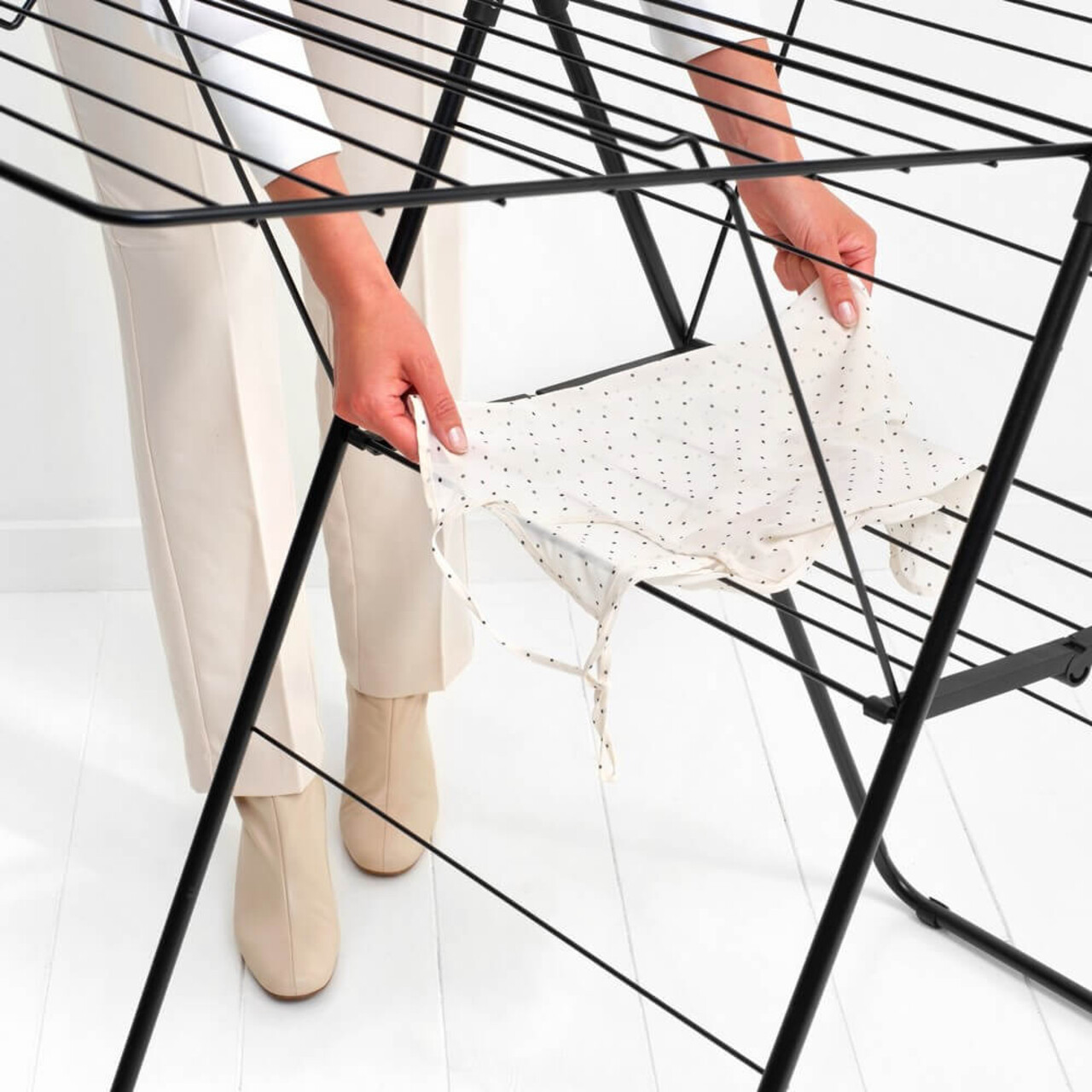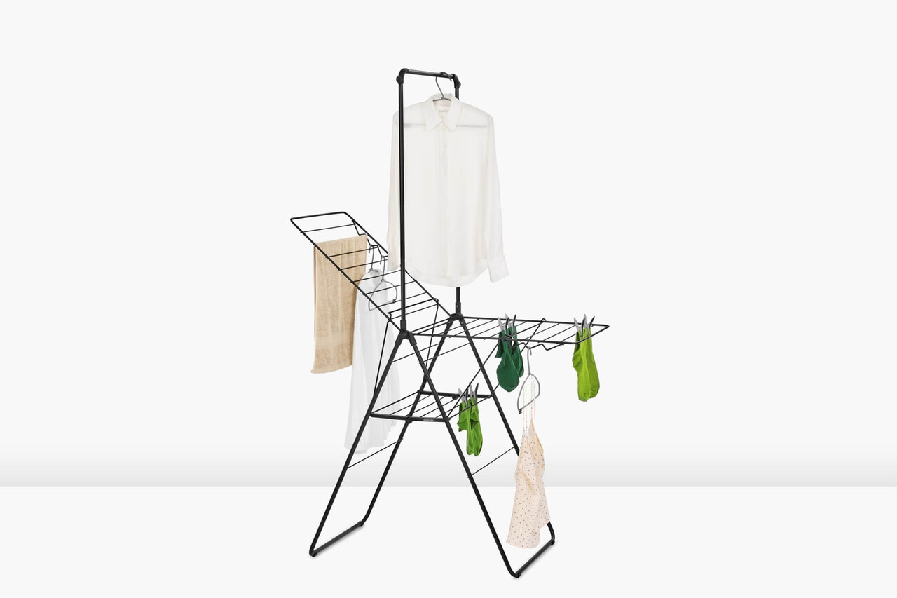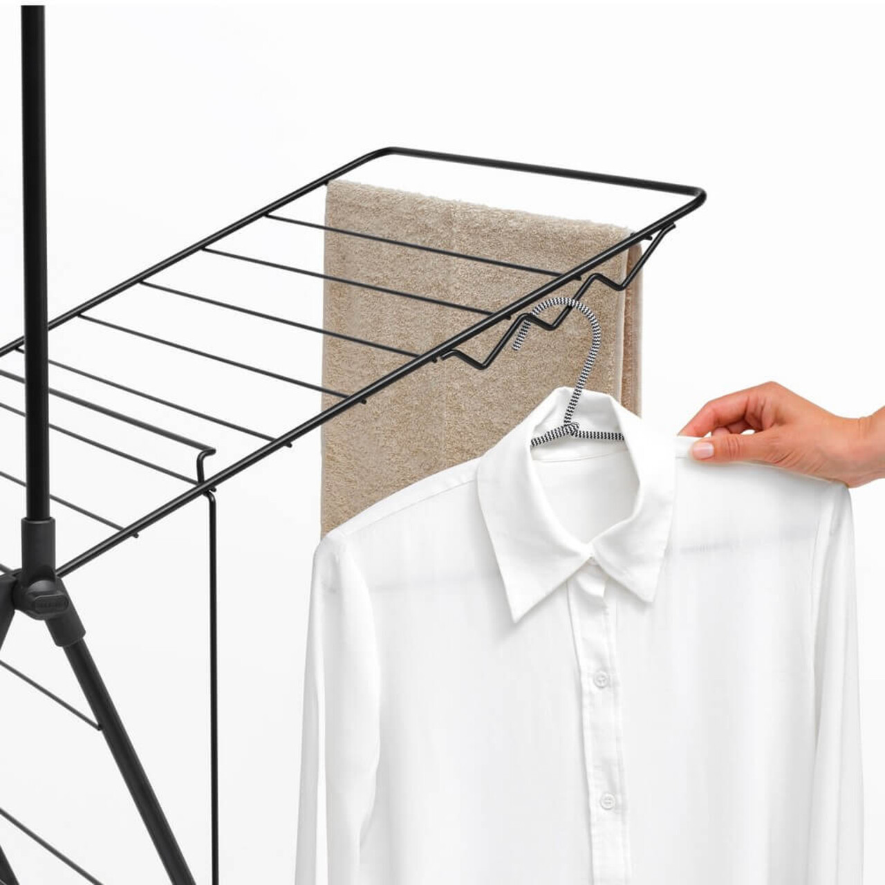 Economiseste timp si energie uscand rufele in mod natural – si economiseste spatiu cu acest suport inteligent!Cu uscatorul de rufe Brabantia HangOn, care ofera 20 de metri de spatiu flexibil pentru uscare si loc pentru 6 umerase suplimentare, poti usca pantalonii pe verticala sau hainele delicate pe orizontala, oriunde in casa. Dupa utilizare, il pliezi rapid si il depozitezi cu usurinta. Un suport de uscare excelent!Avantaje si specificatiiPoate sustine pana la doua masini de rufe – 20 de metri de spatiu pentru uscare.Dimensiuni uscator de rufe pliat: 7x66x99 cm.Pentru articole mari si mici – inaltimea aripilor este ajustabila.Economiseste spatiu – dimensiune compacta cand este pliat si usor de deschis.Ideal pentru bluze si camasi – include 6 carlige pentru umerase si o tija de agatat pentru cel putin 10 umerase in plus (max 10 kg).Usor de mutat, chiar si incarcat cu rufe – cu sistem de blocare pentru transport.Fara surprize neplacute – sistem de siguranta pentru copii previne plierea accidentala.Potrivit pentru uscarea delicatelor pe orizontala – cu platforma speciala.Protejeaza podeaua – capace robuste, antialunecare.Prietenos cu planeta – certificat Cradle-to-Cradle®.Sustenabil – economiseste energie si sustine WeForest in plantarea de copaci.Pentru uz interior si exterior limitat – rezista la soare, dar nu este recomandat in ploaie sau medii corozive.