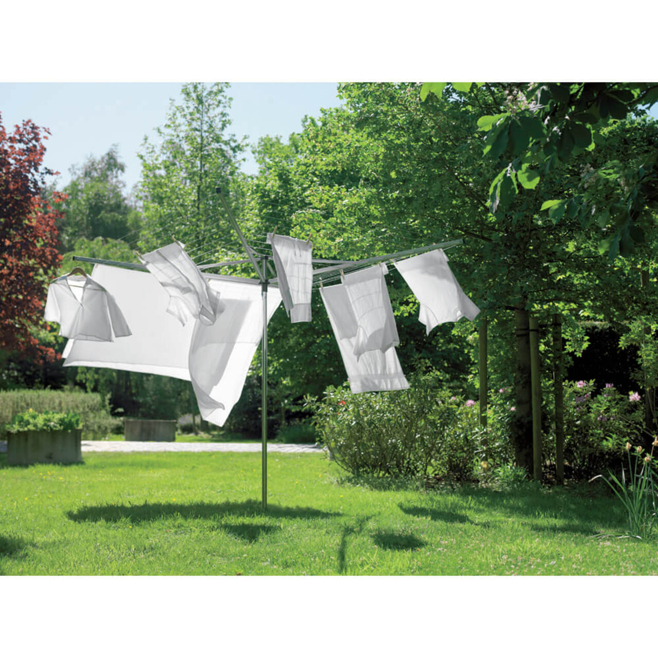 Uscator rotativ EssentialAvantaje si specificatiiBucla de suspendare robustaSfoara de spalat rezistenta la UV cu profil anti-alunecare – usor de inlocuit linii separateToate bratele sunt echipate cu gauri speciale pentru umeraseIdeal pentru rufe delicateInclus: tub de pamant din plastic Ø 35 mmDisponibil separat: husa rezistenta la intemperii - cod 90300217Disponibil separat: tarus de metal pentru pamant Ø 35 mm cu capac de inchidere - cod 90300211