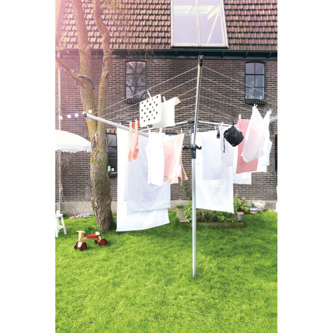 Uscator de rufe rotativ cu 4 brate + cu suport fixare pamant + husa + set carlige rufe Brabantia Lift-O-Matic 60 m capacitate de uscare otel gri metalizat