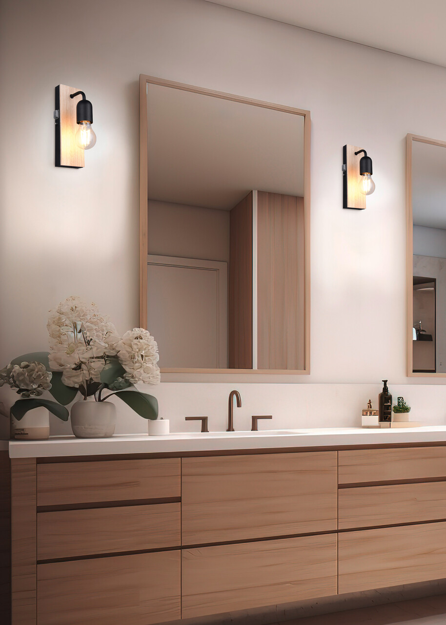 Aplica de perete Arturo de la TRIO îmbină lemnul natural cu metalul negru elegant, aducând un accent modern în orice baie. Cu un grad de protecție IP44, este perfectă pentru spații umede, asigurând o iluminare plăcută și uniformă. Designul său sofisticat permite luminii să strălucească în jur, creând o atmosferă relaxantă. Se recomandă utilizarea unui bec LED pentru o iluminare eficientă și de lungă durată. Arturo transformă baia ta, combinând funcționalitatea cu estetica rafinată, pentru un interior deosebit. Becul nu este inclus.