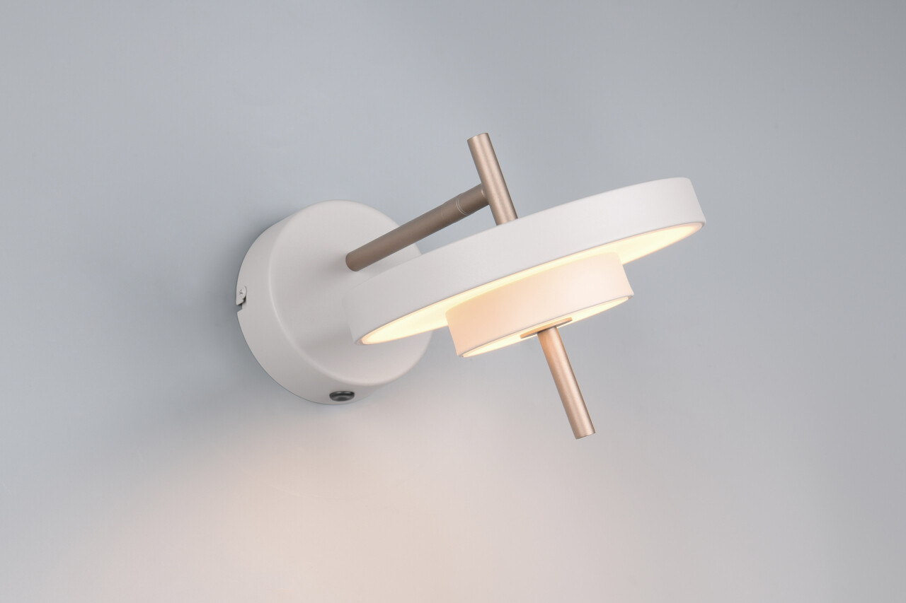 Aplica de perete Keaton de la TRIO, cu dimensiuni de 30x20x18.5 cm și putere de 10W, oferă un design modern în nuanțe metalice gri și auriu. Această aplica este reglabilă, permițând setarea a trei temperaturi de culoare (alb cald, alb neutru, lumina naturală) și ajustarea intensității luminii pe trei niveluri, toate printr-un întrerupător convențional. Durata de viață a LED-ului este de 30.000 de ore, iar indicele de redare a culorii este de 80. Aplica este adecvată pentru montajul pe perete, fiind compatibilă atât pentru conectarea fixă, cât și pentru utilizarea cu cablu de priză (cablul nu este inclus).