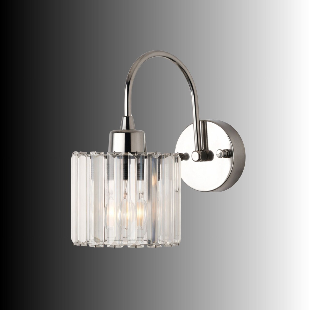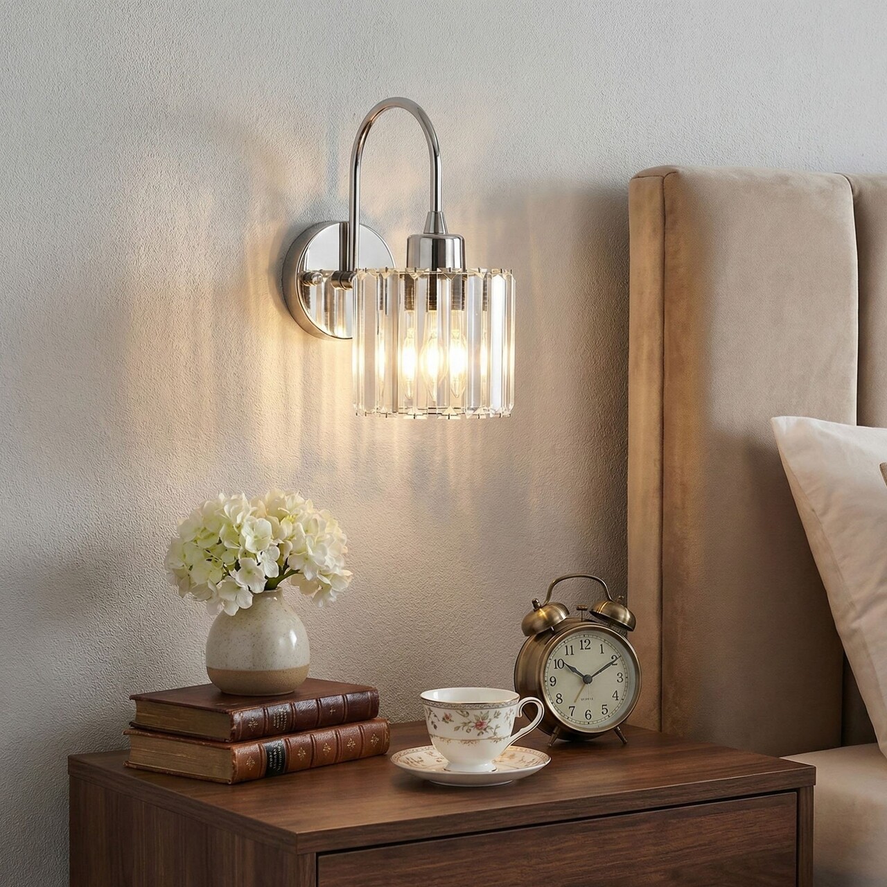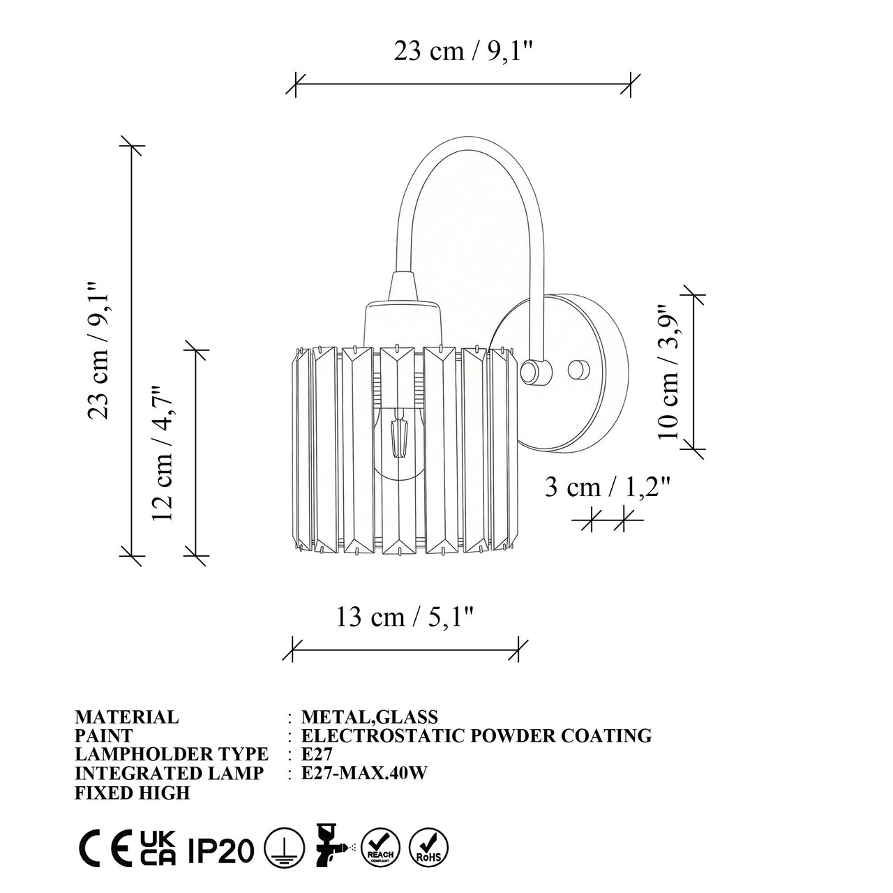 Aplica de pereteAbajur din sticlaDimensiunea capacului: Ø13 h:12 cmDimensiuni baza: Ø10 h:3 cmTip soclu: 1 x E 14 Max 40 WBecul nu este inclus220-240 VGrad de protectie: IP20