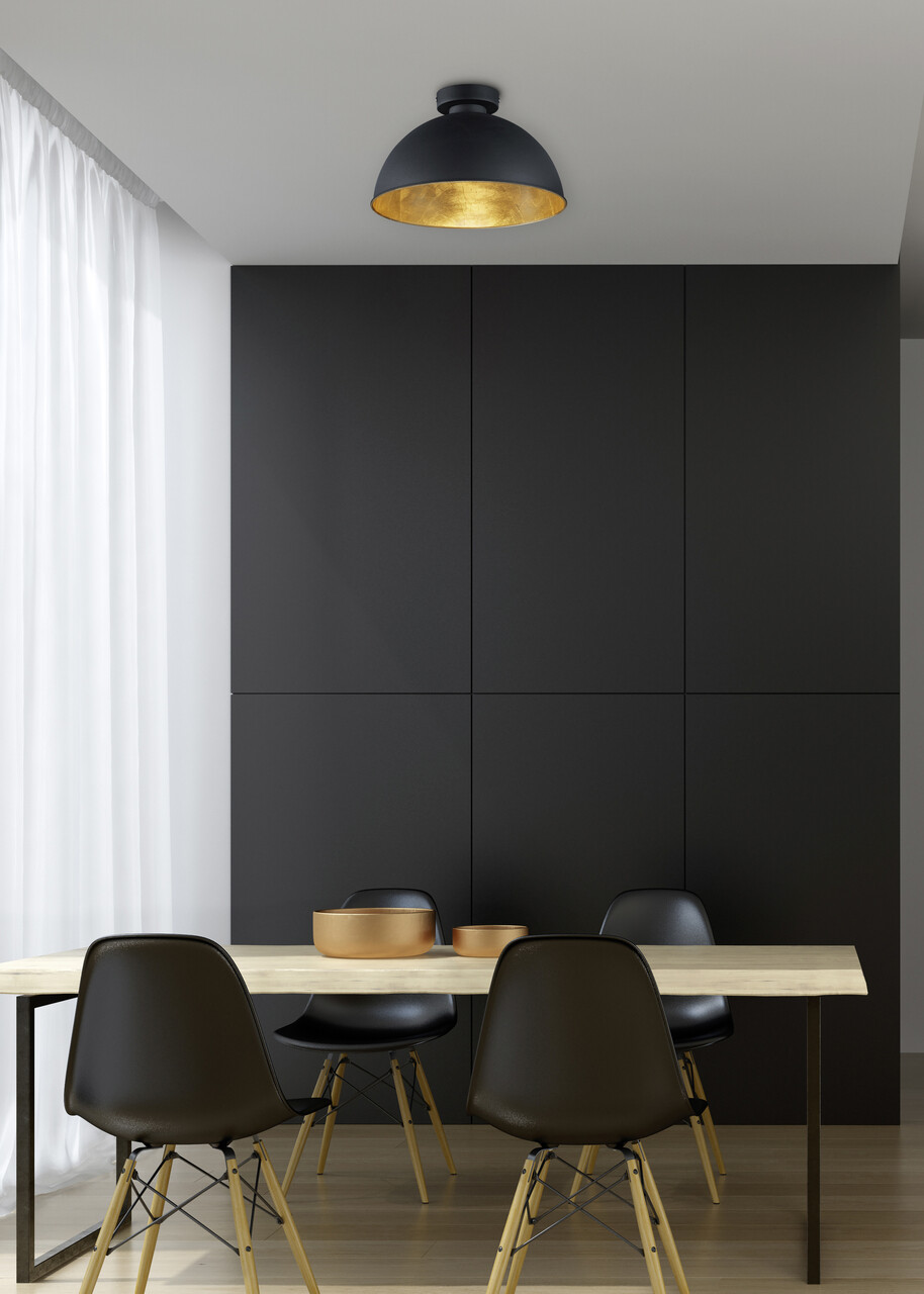 Plafoniera Jimmy are un design minimalist, ideal pentru interioare moderne și puriste. Cu un diametru de 31 cm, abajurul din metal vopsit în negru la exterior și auriu la interior creează un contrast armonios, aducând un plus de atractivitate oricărui spațiu, fie că este vorba despre o bucătărie sau un living. Este recomandată utilizarea becurilor LED pentru un iluminat economic, beneficiind de o durată lungă de viață și reducerea consumului de energie. Corpul are un soclu E27 și o putere maximă de 60W, fiind compatibil cu un grad de protecție IP20.