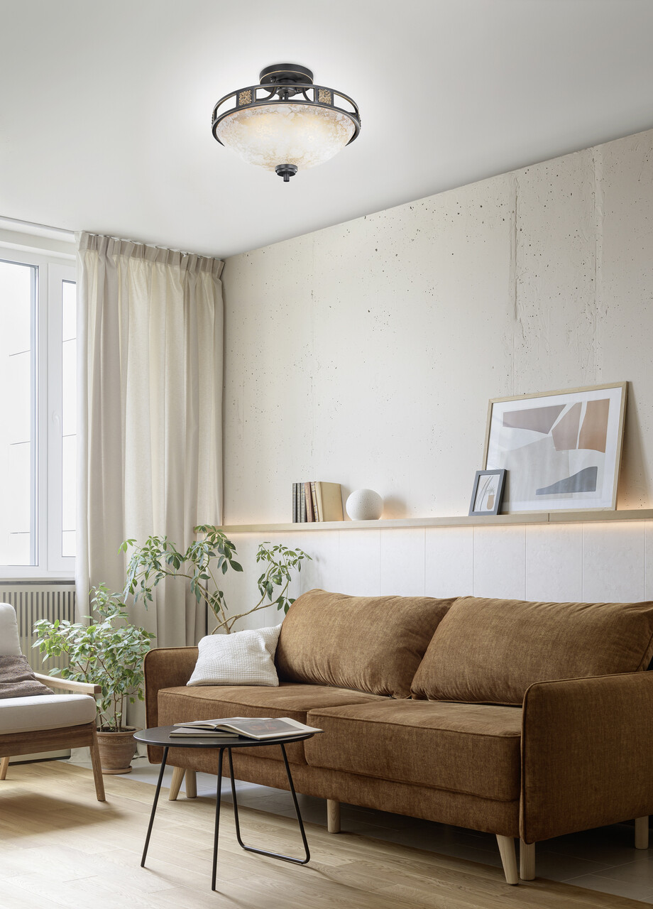 Plafoniera Quinta de la TRIO, cu dimensiuni de 42x32 cm și putere de 60W, aduce un strop de eleganță rustică în orice încăpere. Designul său clasic, cu o ramă metalică de culoare ruginie și ornamente aurii, se îmbină perfect cu stilurile de mobilier rustic și mediteranean. Sticla texturată de culoarea șampaniei emană o lumină blândă, creând o ambianță confortabilă. Recomandăm utilizarea becurilor LED pentru o iluminare modernă, eficientă și durabilă. Plafoniera Quinta este alegerea ideală pentru un plus de stil și confort în locuința dumneavoastră.
