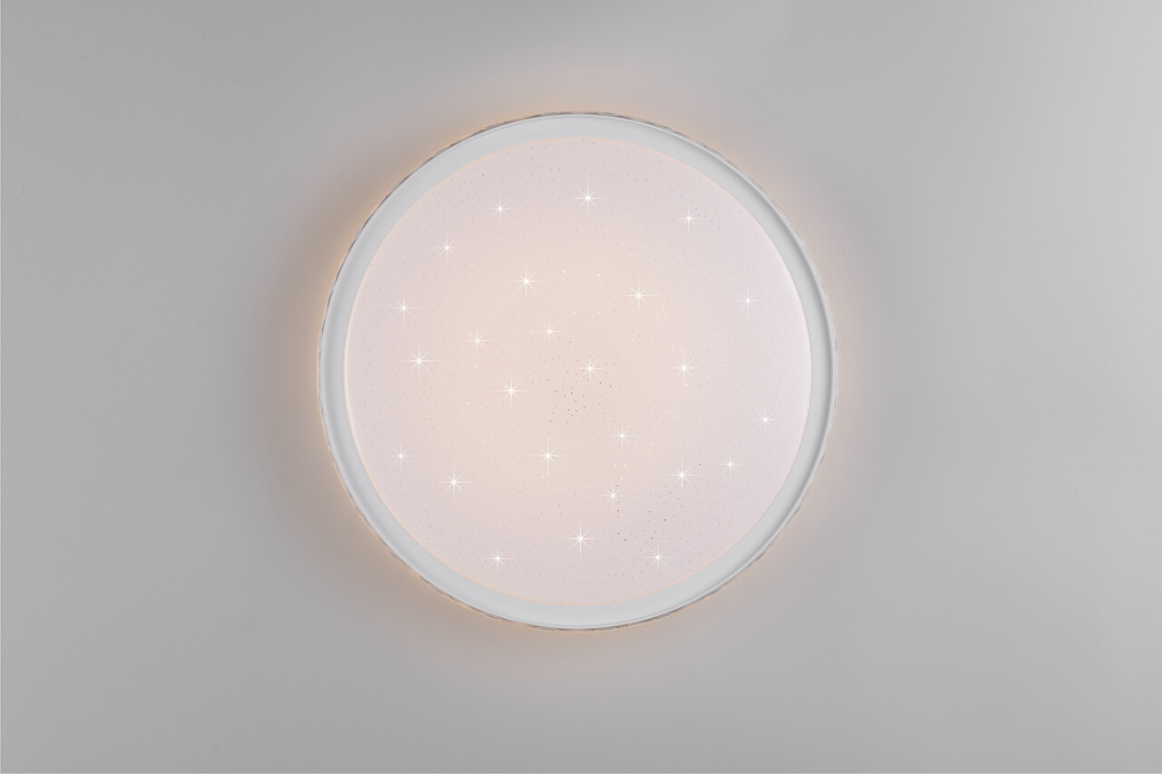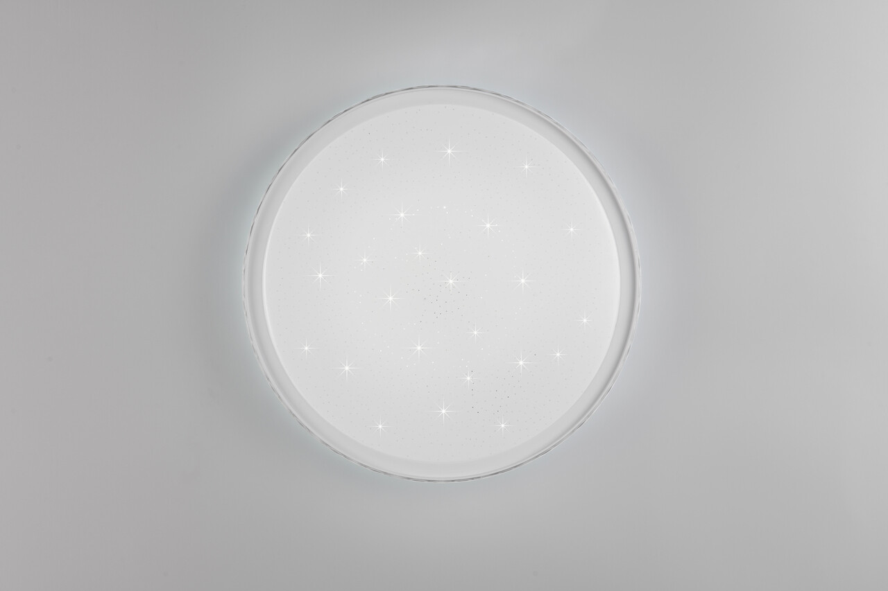 Plafoniera Varda, cu dimensiuni de 39x6 cm și putere de 24W, este ideală pentru montajul pe plafon sau perete. Aceasta dispune de funcția de memorie, păstrând ultima lumină selectată, și de o funcție de lumină de noapte, fiind ușor de controlat cu telecomanda inclusă. Efectul de stele luminoase adaugă un plus de atmosferă, iar intensitatea luminoasă și temperatura culorii (2700/6500K) pot fi reglate continuu. Cu o durată de viață de 20.000 de ore și un grad de protecție IP20, plafoniera Varda combină stilul modern cu funcționalitatea avansată.