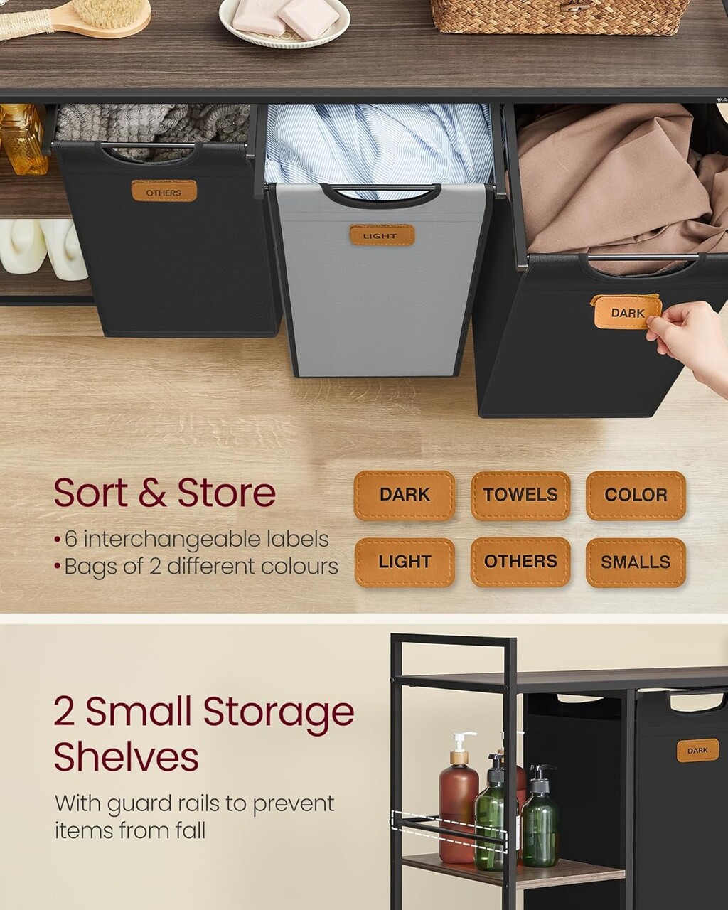 Cosul de rufe VASAGLE cu 3 compartimente, având o capacitate totală de 150 L, este soluția ideală pentru organizarea eficientă a rufelor. Cele trei cosuri de 50 L fiecare, în culori diferite, permit sortarea rapidă, iar cele 6 etichete incluse facilitează identificarea conținutului. Fabricat dintr-un cadru metalic robust, PAL de calitate și tesătură Oxford rezistentă la apă, acest cos este durabil și stabil. Prevăzut cu 4 roți, două dintre ele cu frână, se mută ușor și rămâne fixat. Sacii detasabili și manerele facilitează transportul, iar asamblarea este rapidă, datorită componentelor etichetate și instrucțiunilor clare.