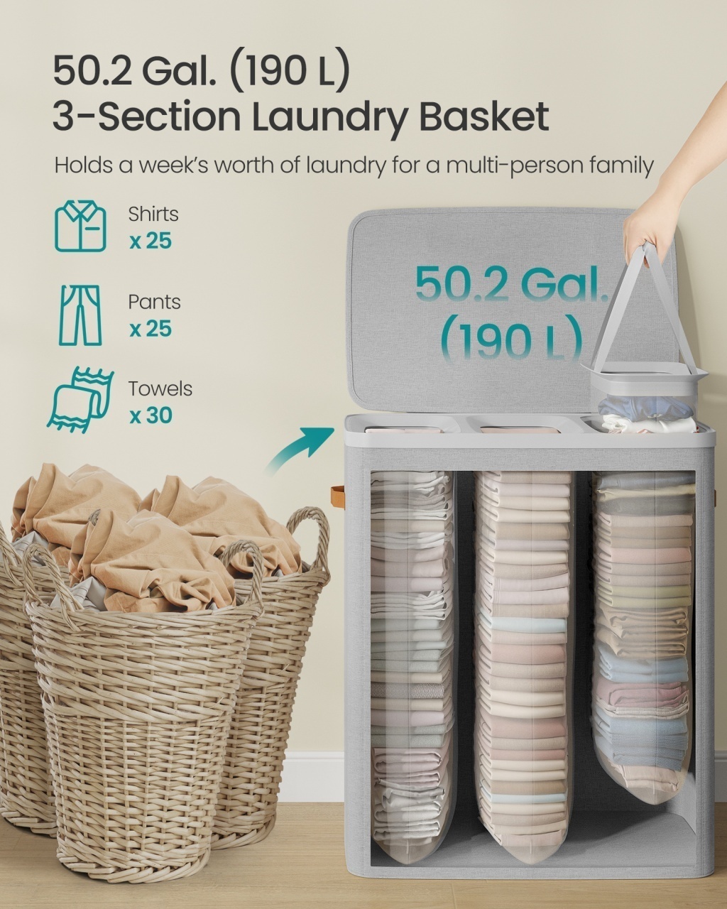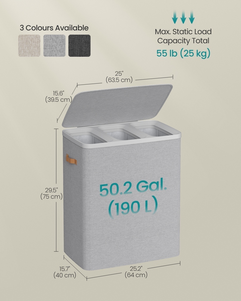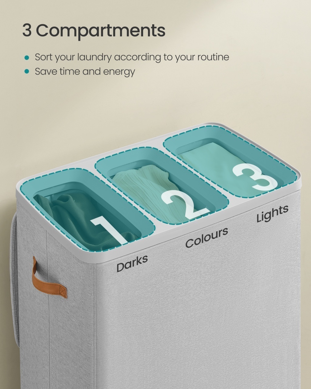 Coș de rufe Songmics 64x40x75 cm — Organizare eficientă pentru întreaga familie Design modern și materiale de calitate Construit pentru a se integra discret în orice ambient, acest coș de rufe afișează o siluetă curată și o nuanță elegantă de gri deschis , conferind încăperii un aer de rafinament și estetică premium. Materialele au fost alese pentru a combina durabilitate și simț tactil plăcut: poliesterul gros, tratat pentru a fi hidrofug, oferă atât protecție pentru haine, cât și un finisaj ușor de întreținut, iar elementele rigide din fibră de sticlă asigură stabilitate constantă. Funcționalitate și organizare Datorită celor trei compartimente separate, acest coș transformă ritualul spălării rufelor într-un proces ordonat, permițând sortarea imediată a rufelor în funcție de culoare sau grad de murdărie și optimizând astfel timpul petrecut la mașina de spălat; volumul generos de 50,2 galoni este suficient pentru o săptămână de rufe pentru întreaga familie. Capacitatea mare, prezența unui capac protector și mânerele plasate inteligent sporesc versatilitatea , spațiul util și posibilitatea de a transporta și goli coșul cu ușurință, protejând în același timp hainele și intimitatea din cămin. Montaj și întreținere Montajul este extrem de simplu și nu necesită scule: se desfă coșul și se inserează cele patru tijă din fibră de sticlă pentru a-i conferi formă, iar sacii interiori sunt deja pregătiți pentru utilizare, cu mânere pentru scoatere facilă. Materialul textil (poliester 150 g/m², hidrofob) permite curățare rapidă prin ștergere sau spălare blândă, iar designul ușor și mânerele multiple asigură o portabilitate excelentă; pentru stabilitate optimă poziționează coșul pe o suprafață plană, evitând supraîncărcarea dincolo de capacitatea maximă recomandată. Comandă acum Adaugă acum în coș acest coș de rufe practic și elegant și transformă rutina spălării rufelor într-un proces ordonat și plăcut. Detalii tehnice complete Dimensiuni și greutate Dimensiuni produs: 64 x 40 x 75 cm Greutate produs: 2.9 kg Capacitate maximă: 25 kg Materiale și caracteristici Material corp: Poliester (150 g/m²), PP (plastic) și fibră de sticlă Material tapițerie/finisaj: Poliester 150 g/m², saci interiori detașabili Culoare: Gri deschis Număr pachete: 1 Montaj și pachet Stare asamblare: Neasamblat Conținut pachet: 1 x Coș de rufe cu 3 compartimente și saci interiori detașabili, 1 x Instrucțiuni Stil și origine Stil: Modern Destinație recomandată: Dormitor, Baie, Hol