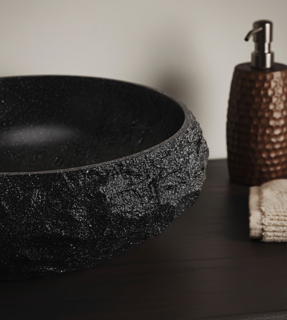 Lavoarul de blat Mika este o propunere pentru cei care doresc să îmbine eleganța cu modernitatea în baia lor. Suprafața sa impresionează prin structura profundă de piatră, care oferă interiorului un caracter unic. Este realizat din materialul inovator Artificial Stone (piatră compozită artificială), care îmbină estetica pietrei naturale cu durabilitatea și funcționalitatea soluțiilor moderne. Se remarcă prin rezistență la deteriorări mecanice, temperaturi ridicate și umiditate. Interiorul neted al vasului garantează ușurință la curățare, iar textura exterioară brută de piatră adaugă caracter și un farmec deosebit interiorului. Este o alegere pentru cei care caută un element de baie elegant și de design, la fel de practic pe cât de spectaculos. Metodă de montaj: De blat Culoare: Negru, Imitație piatră Finisaj: Mat Lungime: 480 Latime : 380 Inalime: 155 Adâncime: 120 Formă: Oval