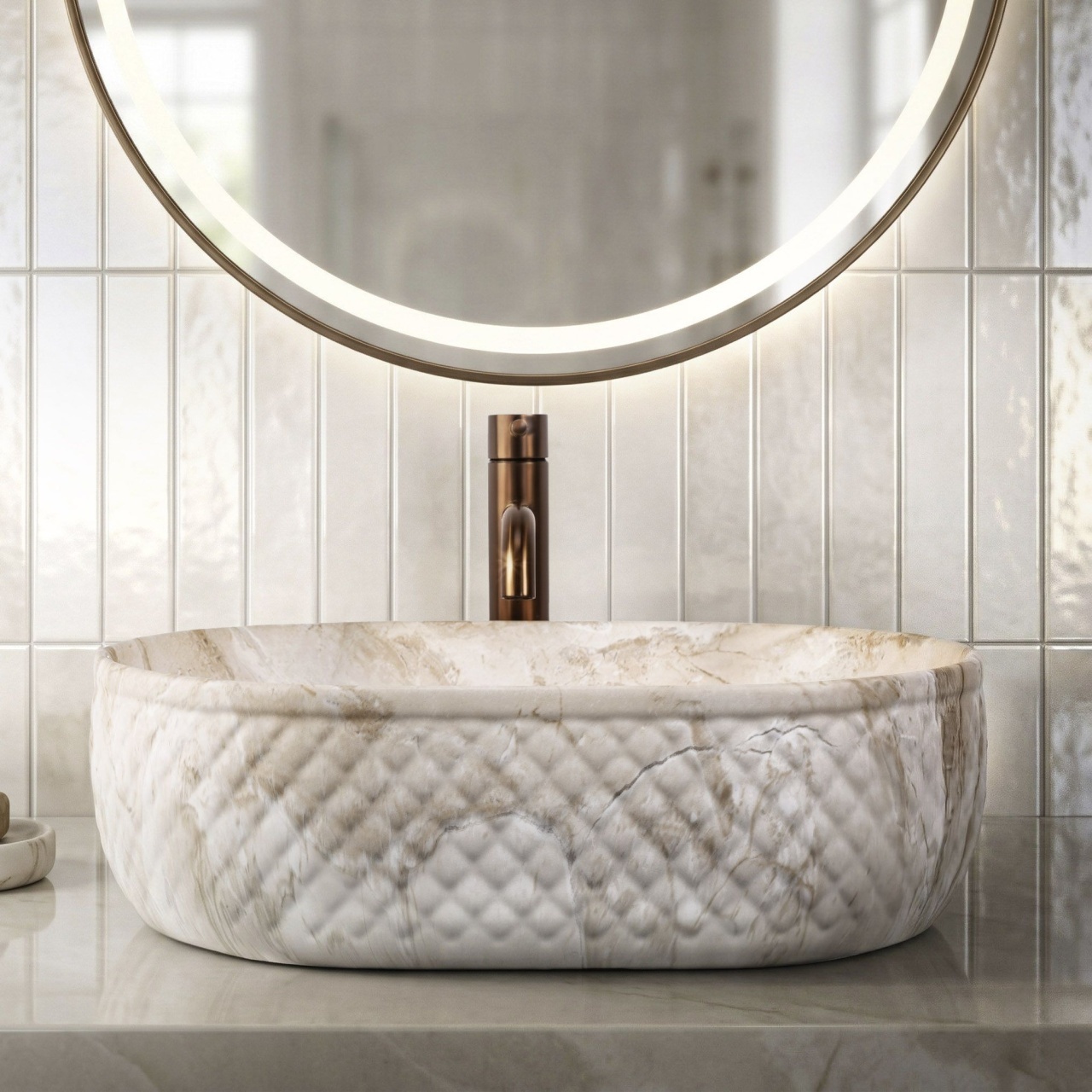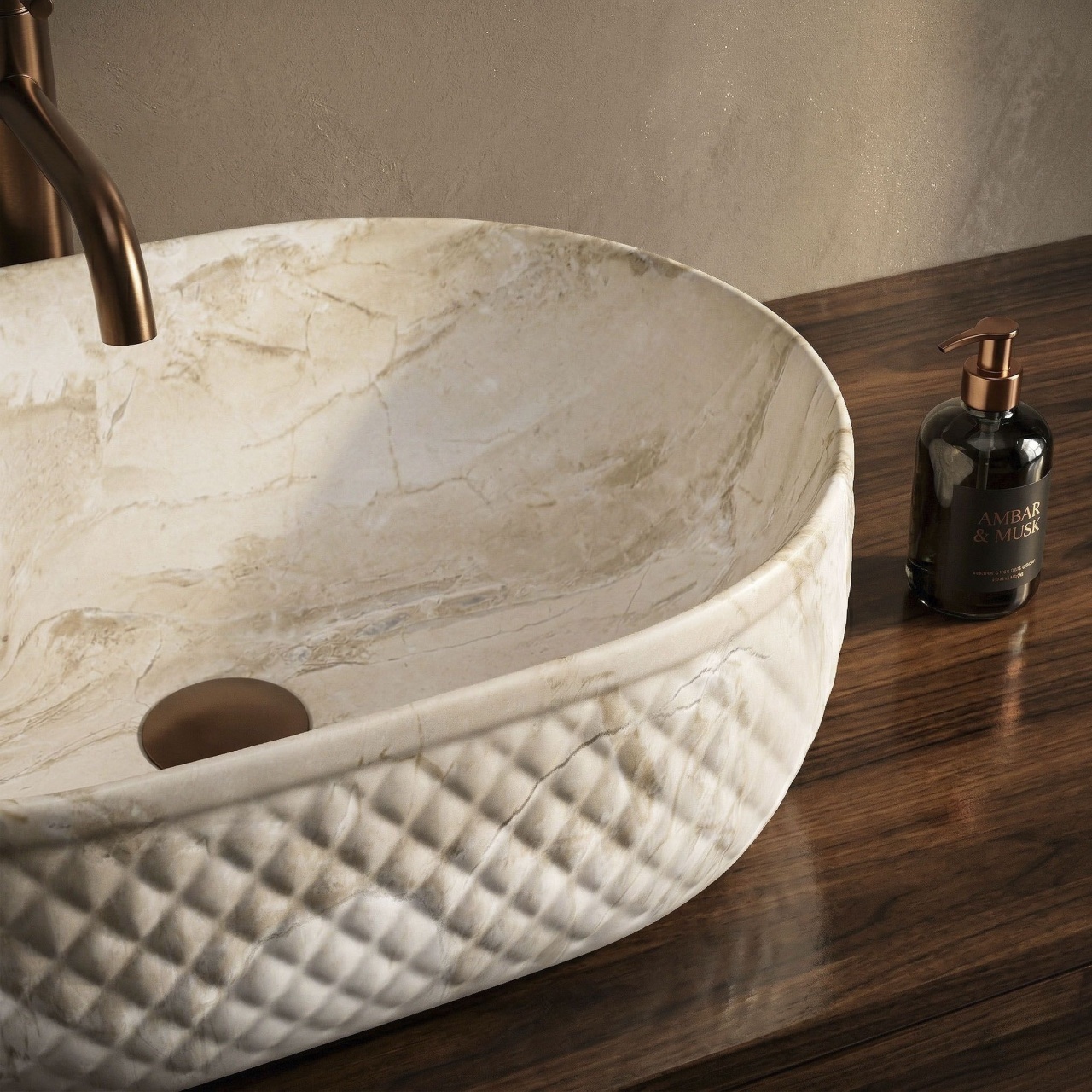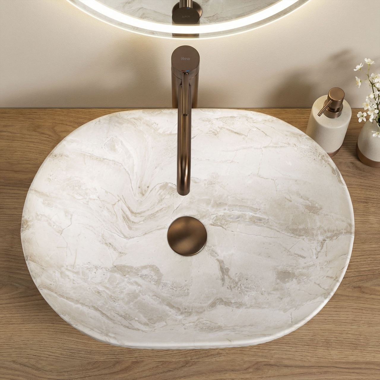 Descoperă combinația extraordinară dintre estetica naturală și forma modernă pe care lavoarul pe blat Oktawia cu model unic ce imită piatra o aduce în interiorul tău. Acest model impresionează nu doar prin linia sa ovală, ci mai ales prin contrastul fascinant dintre interiorul neted și structura exterioară bogată. Realizat din ceramică sanitară de cea mai înaltă calitate, reprezintă un simbol al durabilității și al stilului rafinat, capabil să transforme orice zonă de spălare.Relief exterior spectaculos – structura decorativă caracteristică de pe exteriorul cuvei oferă produsului un efect tridimensional și face ca lavoarul să devină principalul punct decorativ al băii.Model care imită piatra – finisajul satinat cu motiv de venaturi naturale se încadrează perfect în tendințele eco, loft și modern clasic, adăugând interiorului un caracter nobil fără dificultățile întreținerii pietrei reale.Suprafață interioară netedă – asigură evacuarea rapidă a apei și facilitează menținerea unei curățenii igienice, reducând la minimum depunerile de calcar și murdărie.Formă ovală universală – forma ergonomică a cuvei previne stropirea blatului cu apă, asigurând confort maxim în timpul rutinei zilnice. Alegând acest model de lavoar pe blat Oktawia de la REA, investești într-un produs care îmbină aspectul estetic și elegant cu precizia execuției. Se potrivește perfect cu baterii în culoarea aurului, cuprului sau negrului mat, creând un decor coerent și luxos. Este alegerea ideală pentru persoanele care caută soluții neconvenționale, ce combină inspirațiile naturale cu funcționalitatea la cel mai înalt nivel. Metodă de montaj: De blat Material: Ceramică sanitară Culoare: Imitație piatră Finisaj: Mat Lungime: 500 Latime : 355 Inalime: 150 Adâncime: 120 Formă: Oval