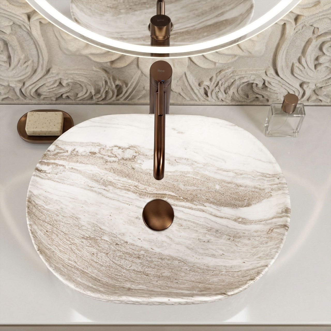Descoperă combinația extraordinară dintre estetica naturală și forma modernă pe care lavoarul pe blat Oktawia cu model unic ce imită piatra o aduce în interiorul tău. Acest model impresionează nu doar prin linia sa ovală, ci mai ales prin contrastul fascinant dintre interiorul neted și structura exterioară bogată. Realizat din ceramică sanitară de cea mai înaltă calitate, reprezintă un simbol al durabilității și al stilului rafinat, capabil să transforme orice zonă de spălare.Relief exterior spectaculos – structura decorativă caracteristică de pe exteriorul cuvei oferă produsului un efect tridimensional și face ca lavoarul să devină principalul punct decorativ al băii.Model care imită piatra – finisajul satinat cu motiv de venaturi naturale se încadrează perfect în tendințele eco, loft și modern clasic, adăugând interiorului un caracter nobil fără dificultățile întreținerii pietrei reale.Suprafață interioară netedă – asigură evacuarea rapidă a apei și facilitează menținerea unei curățenii igienice, reducând la minimum depunerile de calcar și murdărie.Formă ovală universală – forma ergonomică a cuvei previne stropirea blatului cu apă, asigurând confort maxim în timpul rutinei zilnice. Alegând acest model de lavoar pe blat Oktawia de la REA, investești într-un produs care îmbină aspectul estetic și elegant cu precizia execuției. Se potrivește perfect cu baterii în culoarea aurului, cuprului sau negrului mat, creând un decor coerent și luxos. Este alegerea ideală pentru persoanele care caută soluții neconvenționale, ce combină inspirațiile naturale cu funcționalitatea la cel mai înalt nivel. Metodă de montaj: De blat Material: Ceramică sanitară Culoare: Imitație piatră Finisaj: Mat Lungime: 500 Latime : 355 Inalime: 150 Adâncime: 120 Formă: Oval