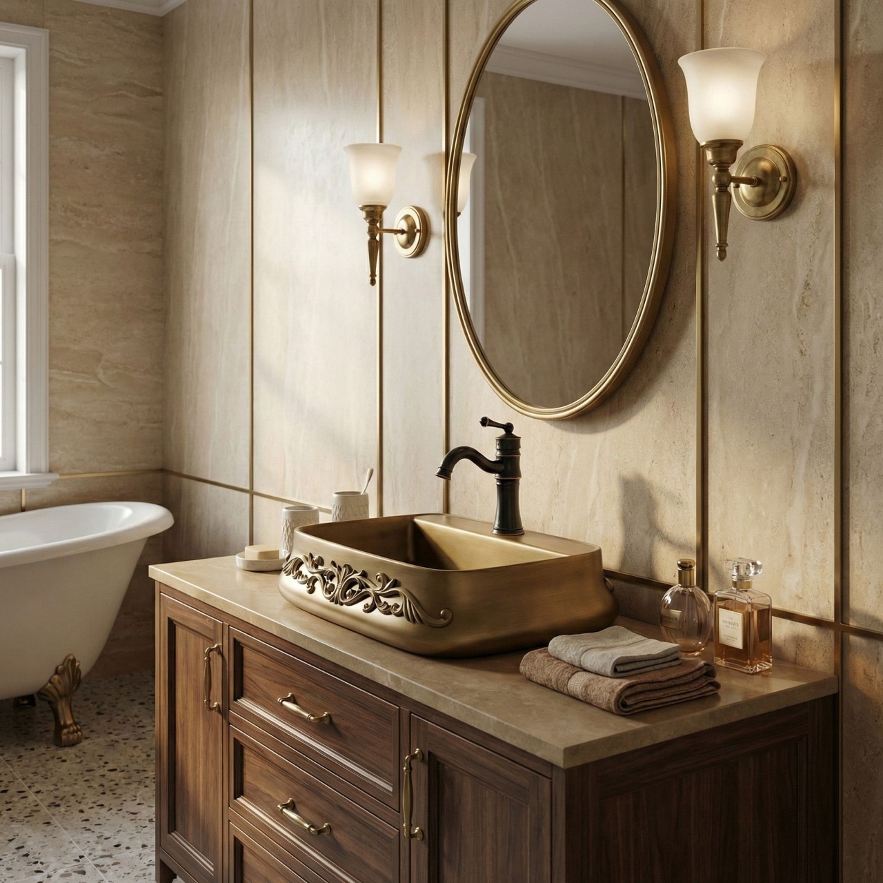 Alege lavoarul ceramic pe blat Rea Castel dacă îți dorești un accent clasic și expresiv în baia ta. Acest model este o propunere excelentă pentru iubitorii stilului retro, vintage și rustic, combinând o formă funcțională cu o ornamentație bogată, deosebit de spectaculoasă.Ornamente deosebite (relief) – partea frontală a lavoarului este decorată cu un motiv floral în relief. Este detaliul care atrage imediat privirea și devine punctul decorativ principal, oferind un caracter elegant, cu aer artizanal.Finisaj în nuanță de alamă antichizată – suprafața ceramicii capătă o culoare unică de bronz patinat. Acest efect vizual intenționat subliniază stilul vintage și adaugă noblețe întregii forme.Poliță cu orificiu pentru baterie – modelul Castel are o poliță integrată cu orificiu decupat din fabrică. Permite montajul comod al unei baterii stative direct pe lavoar, protejează blatul de stropire și ușurează curățenia zilnică.Ceramică sanitară durabilă – lavoarul este realizat din ceramică clasică, solidă. Asigură întreținere ușoară, o suprafață interioară netedă și rezistență la decolorare.Montaj pe blat – instalarea direct pe mobilier sau blat pune în valoare carcasa decorată și marginile profilate, cu linii fluide.Lavoarul Rea Castel este un detaliu statement care poate schimba complet caracterul amenajării. Ornamentația bogată și cromatica caldă se potrivesc perfect în băi în stil clasic, „conac” sau eclectic, creând un spațiu coerent și elegant. Metodă de montaj: De blat Material: Ceramică sanitară Culoare: Cupru, Bronz antic Finisaj: Mat Lungime: 530 Latime : 380 Inalime: 140 Adâncime: 115 Formă: Dreptunghiular Preaplin: Preaplin