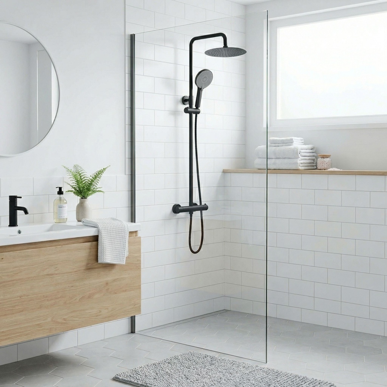 Sistemul de duș Lungo cu termostat în finisaj Negru Mat (Black Matt) este o propunere expresivă pentru iubitorii stilului modern, industrial și ai contrastelor puternice. Forma netedă, minimalistă a seriei Lungo, combinată cu negrul profund, creează un set care oferă băii o eleganță brută și un accent de design. Datorită tehnologiei avansate de vopsire în câmp electrostatic, armătura se caracterizează printr-o durabilitate ridicată și rezistență la utilizarea zilnică.Baterie termostatică – garantează o temperatură constantă a apei, indiferent de schimbările de presiune din instalație, asigurând o baie sigură și confortabilă, fără riscul de opărire.Finisaj Negru Mat – o suprafață mată, catifelată la atingere, care oferă un contrast perfect pentru ceramica și plăcile deschise la culoare.Rezistență ridicată a stratului protector – tehnologia specială de aplicare a culorii protejează setul împotriva coroziunii și a ciobirii, facilitând menținerea curățeniei cu o îngrijire adecvată.Design minimalist Lungo – liniile cilindrice, zvelte, fără detalii inutile, subliniază puritatea geometrică a formei.Sistem de baie complet – setul include o pară de duș tip ploaie mare, rotundă, și o pară de duș manuală ergonomică, cu înălțime reglabilă pe bară.Construcție fără pipă – dedicat cabinelor de duș, setul ocupă spațiu minim, oferind libertate de mișcare și un aspect modern.Materiale solide – corpul din alamă groasă și cartușul termostatic ceramic garantează funcționarea fără defecțiuni timp de mulți ani. Culoare: Negru Material: Alamă, ABS Tip baterie: Termostatată Metodă de montaj: Suprafaţă Reglare înălțime: Reglare înălțime Înălțime min. : 845 Înălțime max.: 1205 Pipa cadă: Nu Reglare a presiunii: Reglare a presiunii Sistem Anti-Calc: Sistem Anti-Calc Tehnologia de acoperire: PVD Distanța dintre racorduri: 150 Model: LUNGO Garantie: 24 luni