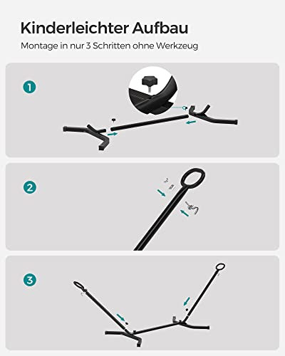Pentru vremurile bune: Intindeti-va cu iubita dvs. pentru a vedea un apus de soare sau cuibariti-va cu copilul dvs. pentru a petrece timpul impreuna... acest hamac - confectionat din tesatura respirabila din bumbac si poliester si cu o capacitate de incarcare de 240 kg - este facut pentru momente de relaxare cu cei dragi.Un suflet relaxat: Da, aici sufletul tau se poate legana, dar nu pe suportul de hamac. Datorita picioarelor extinse pe ambele parti pentru a preveni rasturnarea acestuia, va puteti simti liber sa va relaxati corpul si sufletulCer sau Pamant? Ai vrea sa atingi iarba cu degetele atunci cand stai intins in hamac, sau ai prefera sa atingi stelele? Dispunand de 5 inaltimi reglabile disponibile, puteti regla inaltimea hamacului cu usurintaS-a terminat inca? Copiii tai nu se pot opri sa te intrebe cand asamblezi suportul de hamac? Nu si de data aceasta! Cu o structura simpla si fara a fi nevoie de unelte, vei monta cu usurinta acest suport de hamac si te vei bucura de rasul lor pe hamac in cateva minute!Unde ati dori sa va relaxati? In curtea din spate si sa te bucuri de timpul petrecut cu copiii, sau pe terasa sa privesti stelele? Oricum ar fi, acest hamac cu suport va duce locul la un alt nivel. Sau, puteti sa scoateti hamacul si sa il puneti in geanta pentru camping!