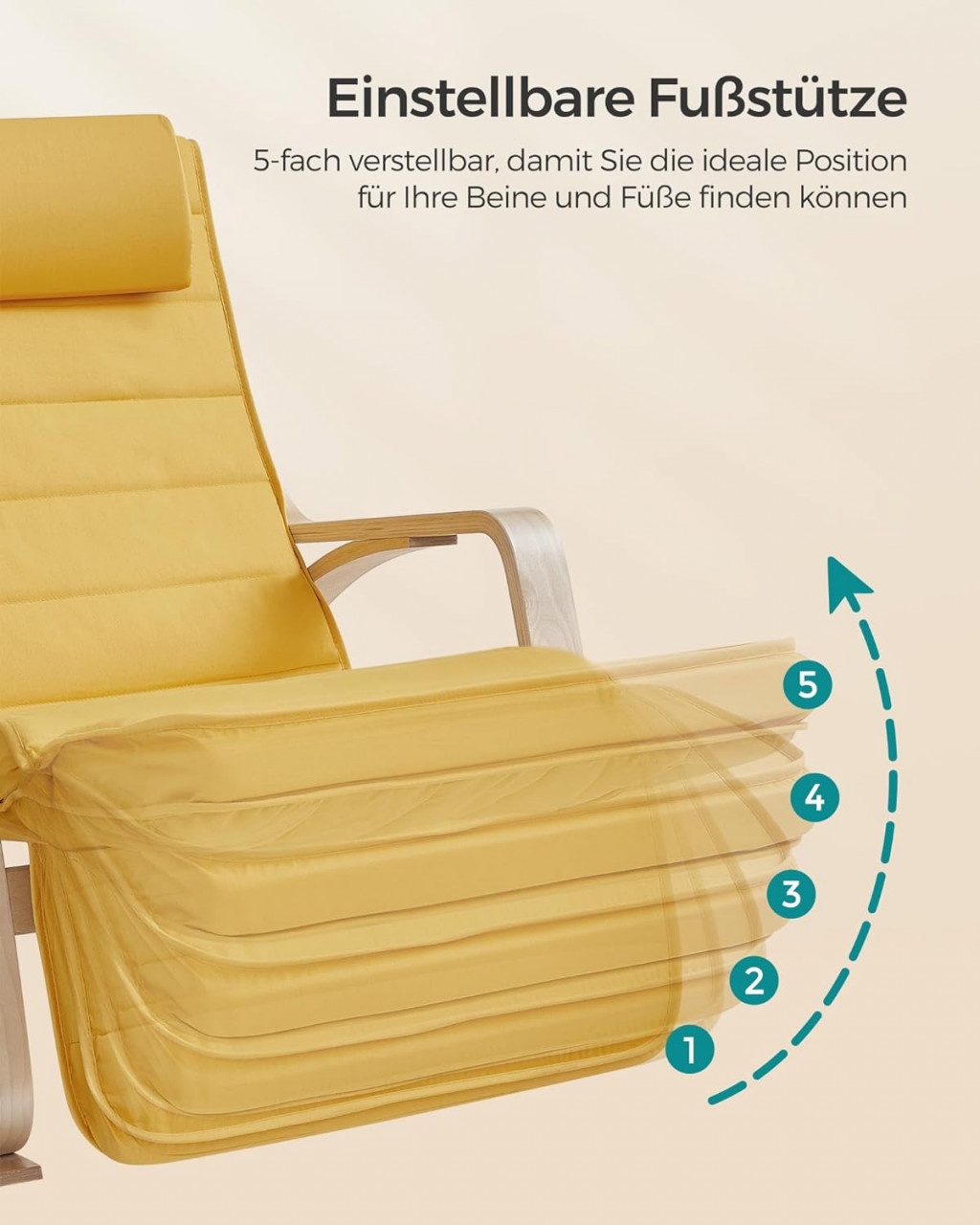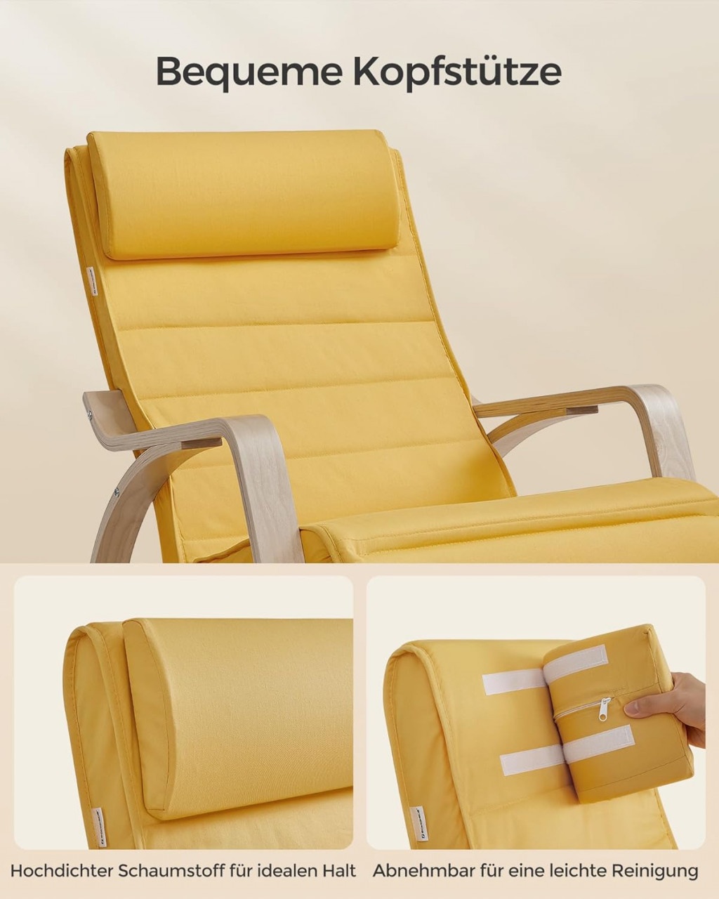 Scaunul balansoar Songmics Galben-Natural, cu dimensiuni de 121.5x67x84 cm, este construit din lemn de mesteacăn de înaltă calitate și un cadru metalic interior, asigurând stabilitate și siguranță, susținând până la 150 kg. Suportul pentru picioare este reglabil în 5 poziții, oferind confort maxim pentru relaxare sau lectură. Pernă scaunului și tetiera sunt căptușite cu spumă elastică, oferind un loc ideal pentru odihnă. Husa este lavabilă, iar tetiera se atașează ușor cu Velcro. Asamblarea este simplă, iar picioarele au protecție antiderapantă pentru podea.