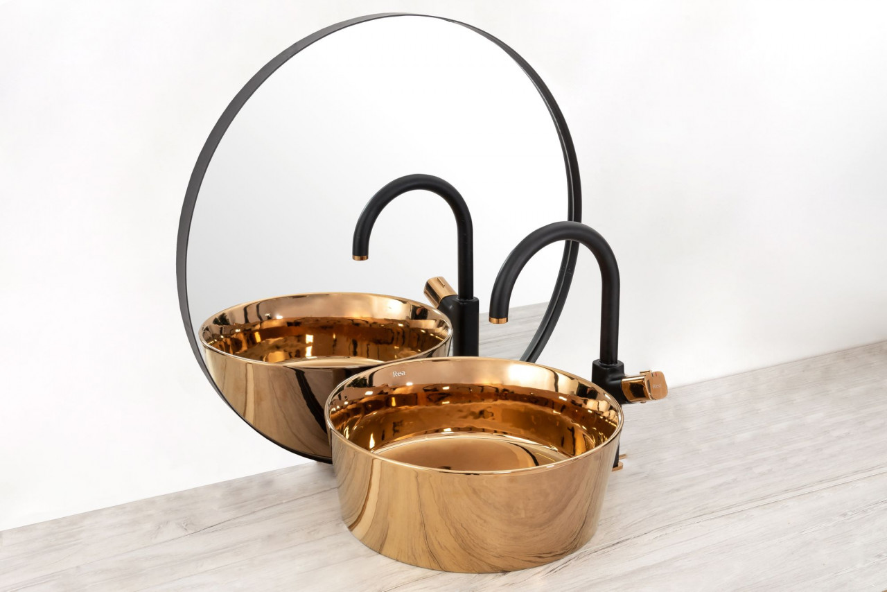 Baterie inalta lavoar pe blat Rea Salto negru mat/auriu gat de lebada