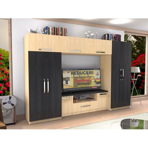 Biblioteca Estrella este soluția ideală pentru un living modern, realizată din PAL Melaminat cu finisaje sonoma și stejar auriu. Usile și fata de sertar sunt dotate cu cant ABS de 2 mm pentru durabilitate, iar capacul comodei TV, cu grosimea de 32 mm, suportă obiecte grele fără a se deforma. Cele 3 usi cu deschidere în sus beneficiază de pistoane pentru o utilizare îndelungată, iar manerele metalice de 340 mm completează aspectul elegant. Picioarele din plastic protejează pardoselile de zgârieturi. Dimensiuni: 3200 mm lungime, 2103 mm înălțime, 563 mm adâncime, cu spațiu pentru televizor de 1600 mm lungime și 1110 mm înălțime.