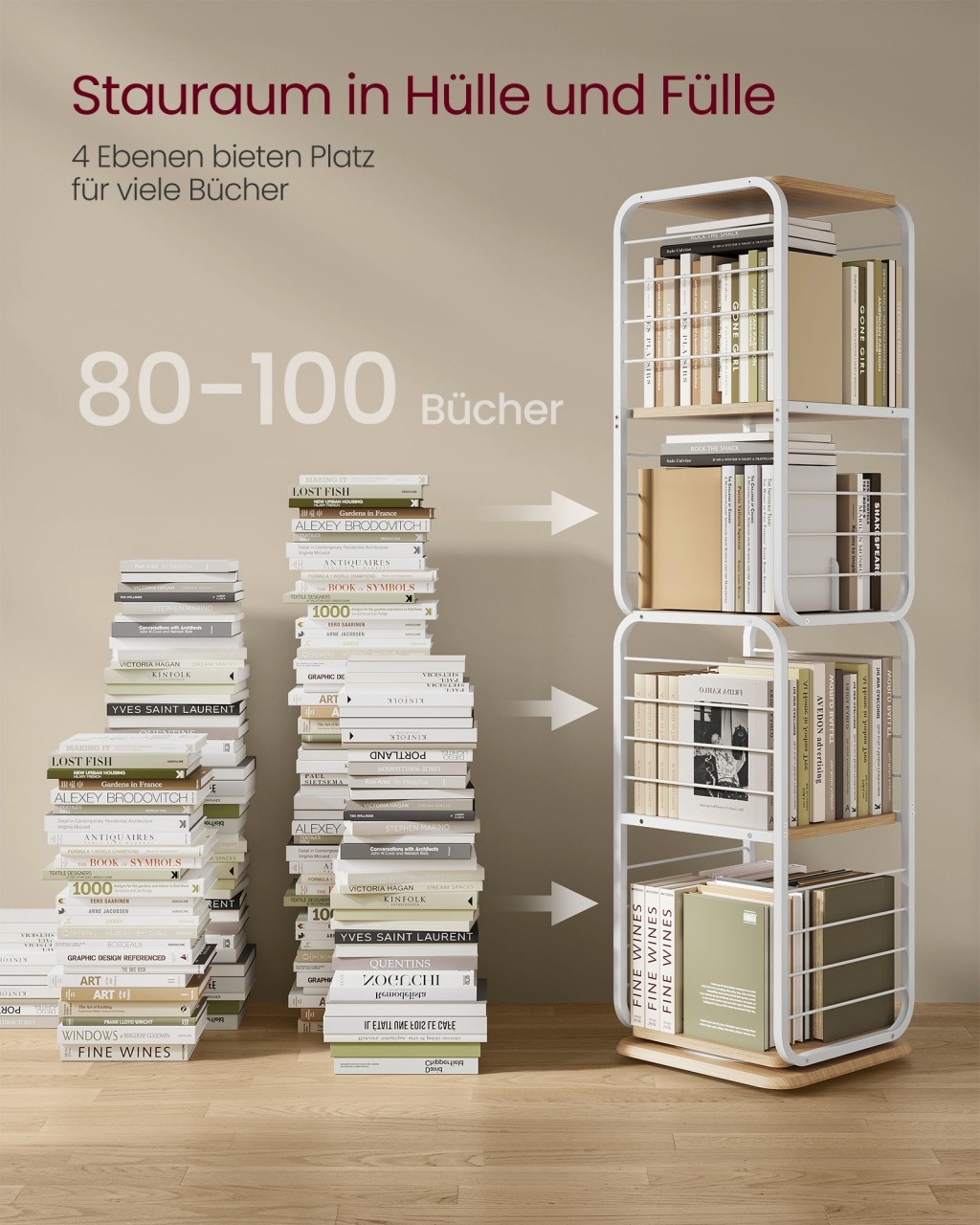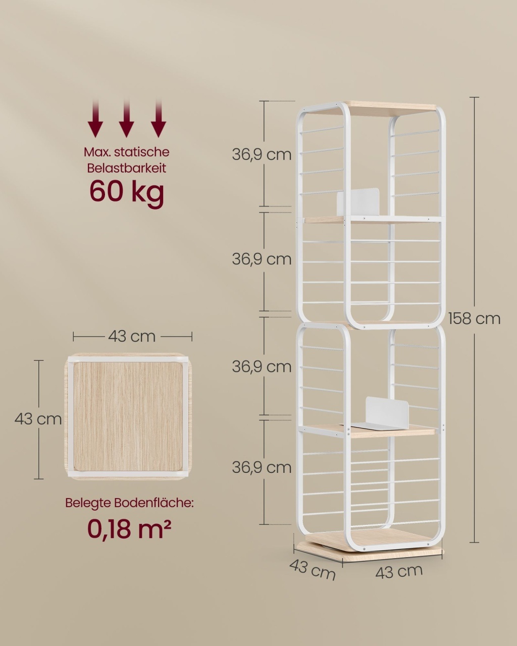 Biblioteca Vasagle Alb 43x43x158 cm este o soluție elegantă și practică pentru iubitorii de cărți. Cu un design rotativ 360°, accesul la titlurile preferate este rapid și ușor. Apărătoarele laterale din sârmă previn căderea articolelor în timpul rotației, iar rafturile spațioase pot găzdui între 80-100 de cărți de dimensiuni medii. Compactă și versatilă, se integrează perfect în orice decor, iar kitul anti-răsturnare și picioarele reglabile asigură stabilitatea. Montajul este simplu, datorită instrucțiunilor clare și pieselor etichetate.