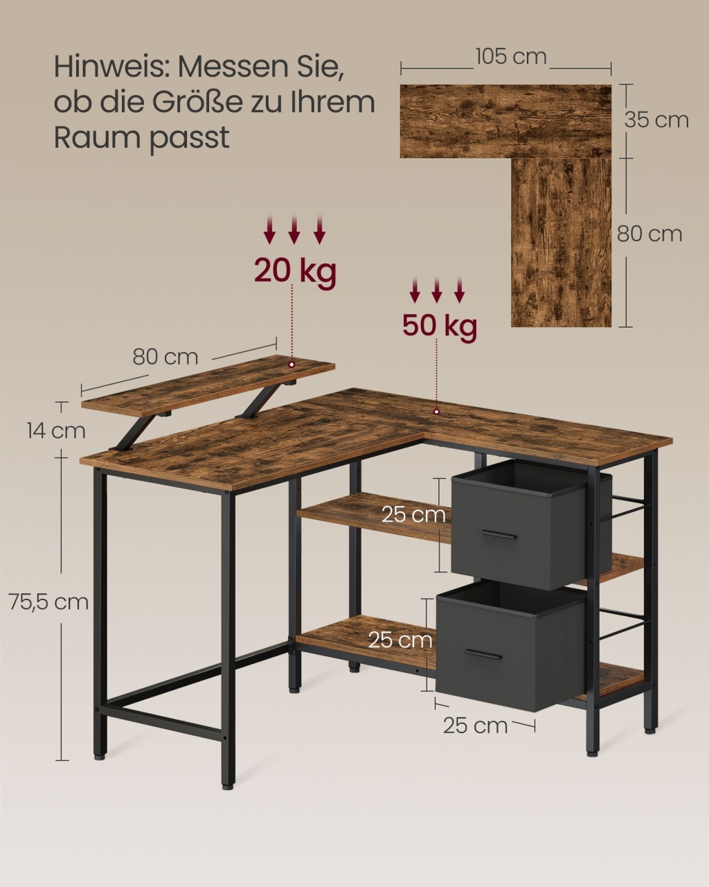 【REVERSIBIL ȘI VERSATIL】Acest birou în formă de L, cu dimensiunile 105 x 115 x 89,5 cm, are un design reversibil care vă permite să instalați sertarele fie pe partea stângă, fie pe partea dreaptă, potrivindu-se perfect în orice colț al biroului dvs. de acasă, dormitor. , sau sufragerie.【SPAȚIU AMPLUT DE DEPOZITARE】Dispunând de 2 sertare spațioase de depozitare, acest birou de colț oferă spațiu amplu pentru dosare și articole esențiale de birou. Raftul din mijloc este reglabil la 3 nivele de înălțime, pentru a satisface cerințele dvs. de depozitare.【ROBUT ȘI ROBUST】Construit cu un cadru de oțel și bare transversale întărite, acest birou pentru computer poate suporta până la 50 kg pe masă și 20 kg pe suportul pentru monitor. Lucrați cu liniște sufletească!【ATENȚIE LA DETALII】Picioarele reglabile asigură stabilitate pe diferite suprafețe și vă protejează podelele de zgârieturi. Spune-ți la revedere oscilațiilor la fiecare apăsare de buton atunci când tastați pe tastatură!【MONTARE UȘOARĂ】Conceput pentru asamblare fără probleme, acest birou vine cu o structură simplă, piese numerotate și instrucțiuni clare , simplificând procesul de asamblare pentru confortul dumneavoastră.Specificații:Culoare: maro rusticMaterial: PAL, oțel, țesătură nețesă, țesătură din polibutonDimensiune produs: 41,3D x 45,3 L x 35,2 H (105 x 115 x 89,5 cm)Greutate produs: 46,2 lb (21 kg)Capacitate maximă de încărcare statică a mesei: 110 lb (50 kg)Capacitatea de încărcare statică a suportului monitorului: 44 lb (20 kg)Conținutul pachetului:1 x birou în formă de L1 x kit de accesorii1 x instrucțiuniMaterial: PAL, oțel ,Tesatura netesuta,Tesatura TCDimensiune produs: 115x105x89 cmDimensiune pachet (LxlxH): 117,5x56,5x12,5Greutate neta: 21 kg Greutate bruta: 24,2 kgVolum : 0,08298438 CBMCuloare: Maro
