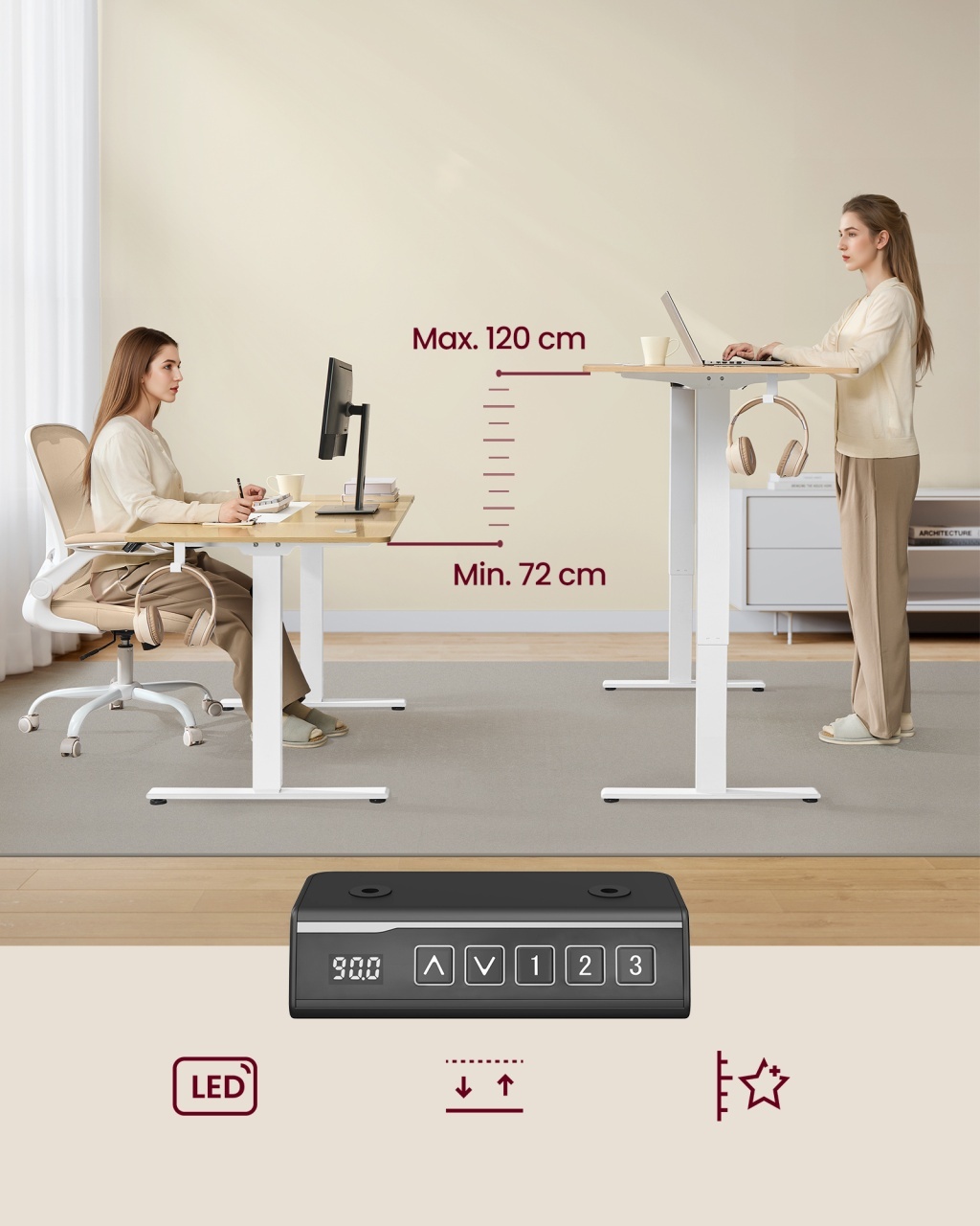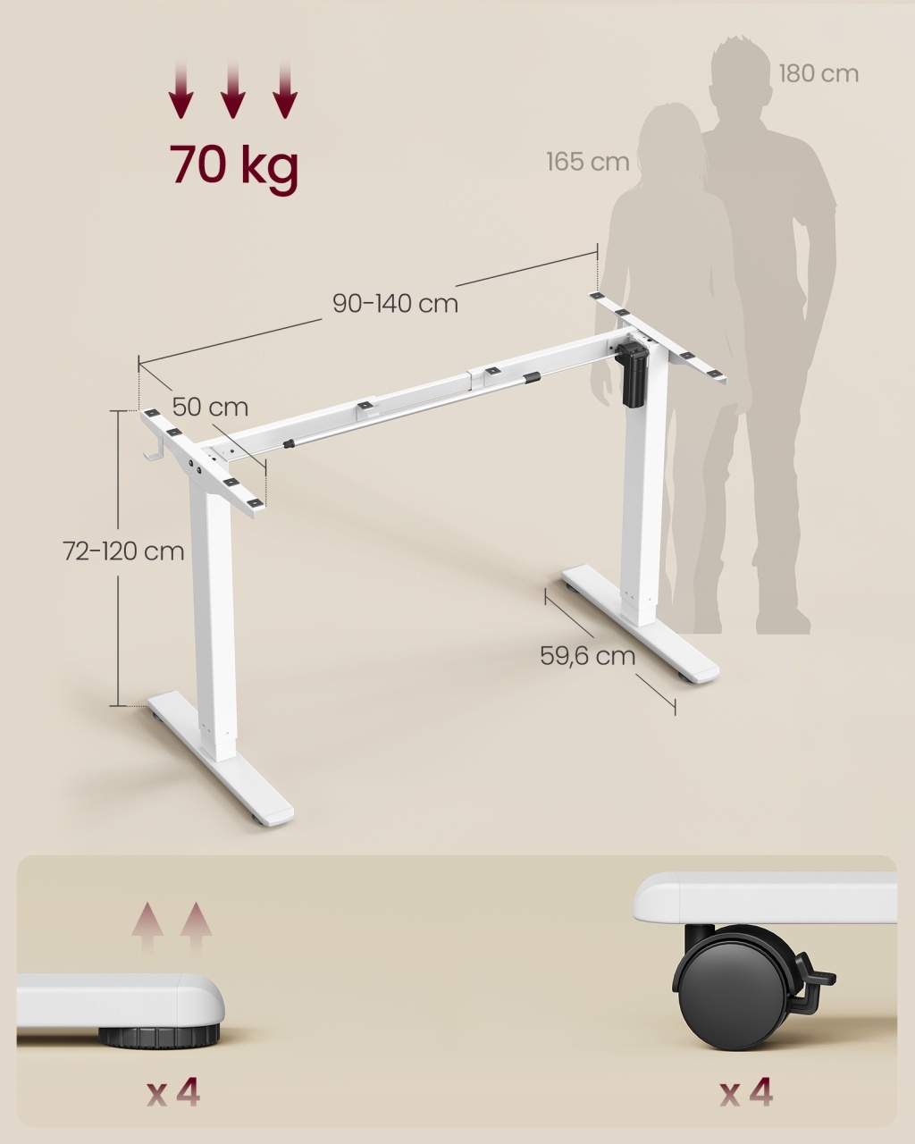 Cadru birou reglabil Vasagle, 140x59.6x119 cm, oferă libertate ergonomicǎ și un design modern. Construit din oțel robust, cu finisaj alb mat, acest cadru se integrează perfect în orice spațiu de lucru. Reglajul telescopic permite ajustarea între 90-140 cm lungime și 71-119 cm înălțime, optimizând postura utilizatorului. Motorul silențios, cu 3 memorii de înălțime, asigură tranziții rapide și discrete. Capacitatea maximă de 70 kg și accesoriile incluse contribuie la organizarea eficientă. Asamblarea este rapidă și ușoară, iar întreținerea se face simplu. Transformă-ți biroul cu acest cadru elegant!