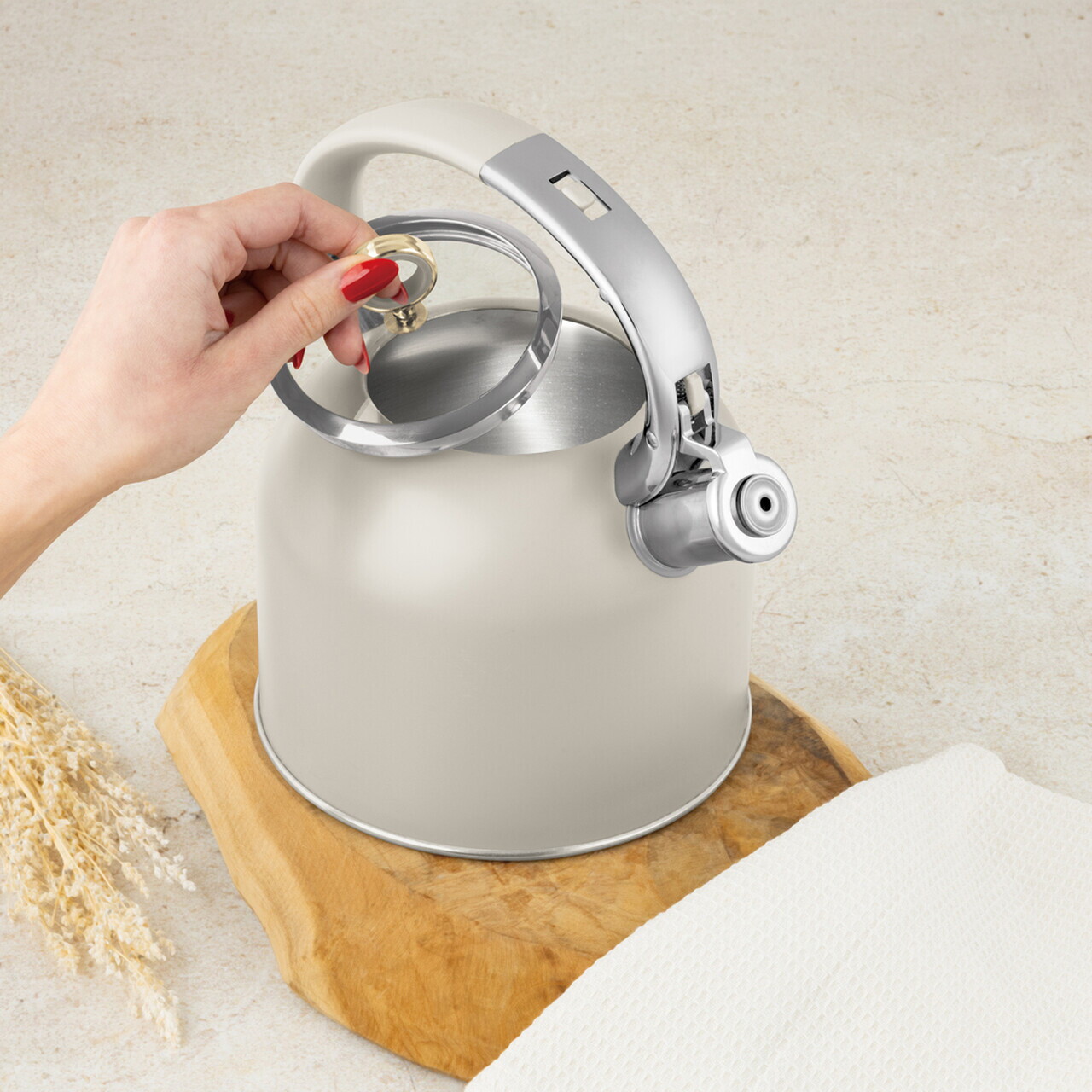 Maner ergonomic, moale la atingerePotrivit pentru inductiePotrivit pentru toate tipurile de pliteCapac din sticla securizata cu margine din otel inoxidabilConfortabil in utilizareUsor de curatatElegantMaterial: otel inoxidabil 18/10 cu acoperire pulbere mata, sticlaCapacitate: 3 LCuloare: crem mat
