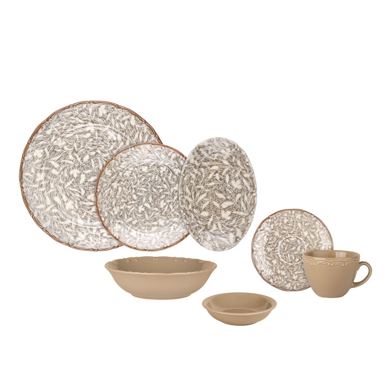 Set de mic dejun (26 de piese)Platou servire desert: 19 cm (6 piese)Farfurie intinsa: 27 cm (1 piesa)Platou servire: 20 cm (2 piese)Bol: 20 cm (1 piesa)Mini-bol: 11 cm (4 piese)Ceasca de ceai: 240 ml (6 piese)Farfurioara ceasca ceai (6 piese)
