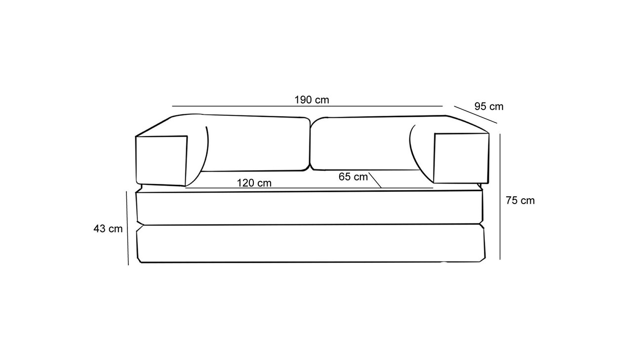 Canapea 3 locuriLatime: 190 cm Inaltime: 75 cm Adancime: 95 cmAdancime sezut: 65 cmInaltime sezut: 43 cmInaltimea spatarului: 32 cmDimensiunea patului: Latime: 190 cm Adancime: 155 cmUmplutura din spuma moale 28 DNS pentru sezut si spatarPrietenos cu mediul