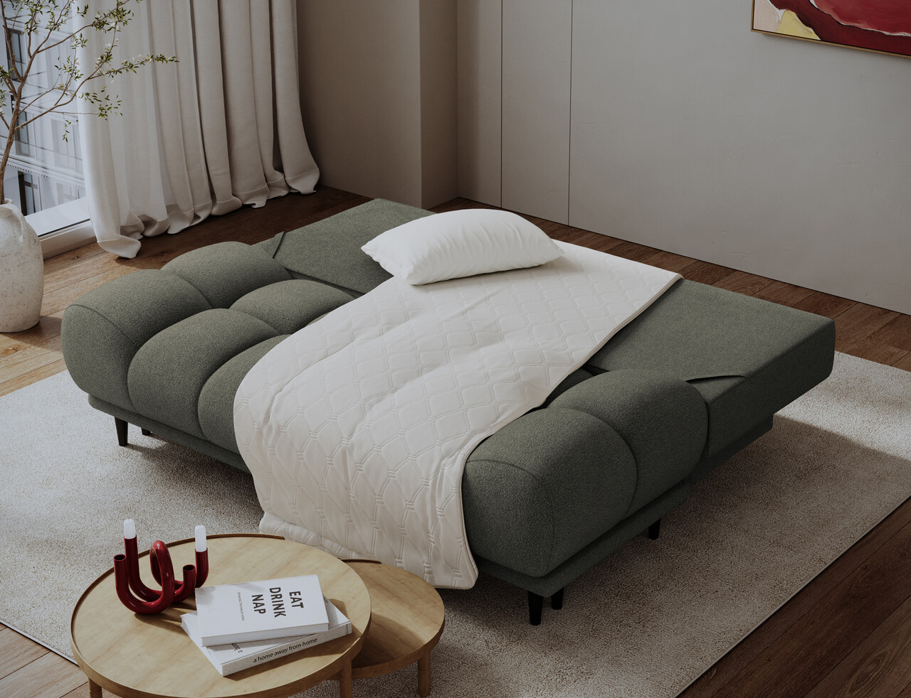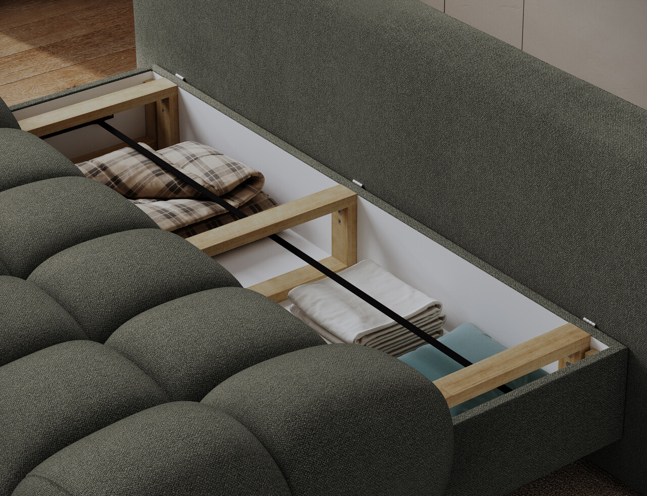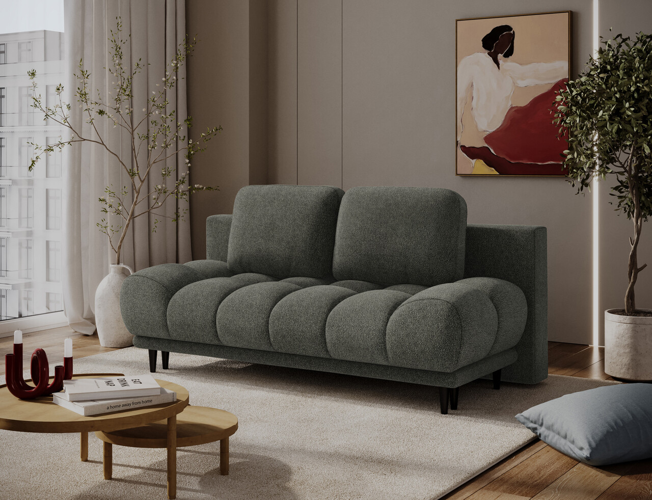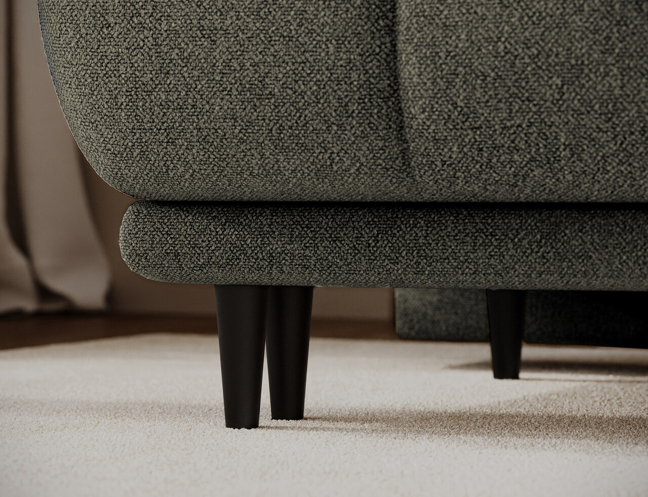 Canapeaua extensibilă 2 locuri ELTAP Guavio, cu dimensiunile de 210x77x97 cm, aduce un plus de confort și stil în orice interior modern. Tapiteria din 100% poliester de culoare verde olive, combinată cu un cadru din lemn de pin, asigură durabilitate și estetică. Sezutul este dotat cu arcuri ondulate tip B și spumă HR3030 pentru un confort deosebit, iar pernele spătarului, umplute cu granule de spumă, se adaptează corpului. Canapeaua dispune de funcție de dormit cu o suprafață de 140x210 cm și un mecanism DL ce facilitează transformarea rapidă. Compartimentul pentru lenjerie ajută la menținerea ordinii. Picioarele din lemn negru completează designul elegant.