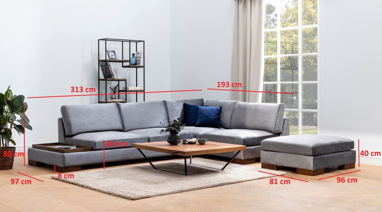 Colțarul Atelier del Sofa 560ARE1162 în gri închis aduce un plus de confort și eleganță în orice spațiu. Cu dimensiuni de 313 x 193 cm și o lățime de 97 cm, acesta oferă ample locuri de șezut. Este realizat dintr-o țesătură din poliester, ușor de curățat, iar spuma de 28 DNS și spuma de silicon asigură o ședere plăcută. Colțarul include două perne cu 60% spumă tăiată și 40% spumă de silicon, iar picioarele din lemn de nuc adaugă un aspect rafinat. Puful inclus și perna portabilă pentru șezut/spătar completează confortul acestui colțar.