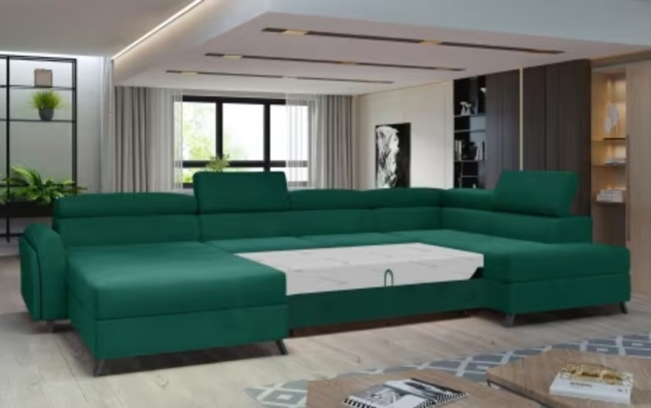 Colțarul extensibil Josette de la Eltap este un element multifuncțional, confortabil și spațios, cu un design elegant în formă de U. Cu dimensiuni de 370x190x98 cm, este realizat din lemn de pin și îmbrăcat în poliester de înaltă calitate, având o nuanță verde închis. Sezătura generoasă de 55 cm adâncime, umplutura din spumă HR și T30, împreună cu picioarele din metal și lemn, asigură un confort deosebit. Mecanismul de extindere tip delfin permite transformarea ușoară în pat, având o suprafață de dormit de 110x300 cm. Cu tetiere reglabile și o greutate maximă suportată de 405 kg, Josette este alegerea ideală pentru un living modern.