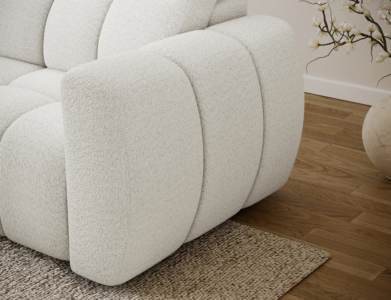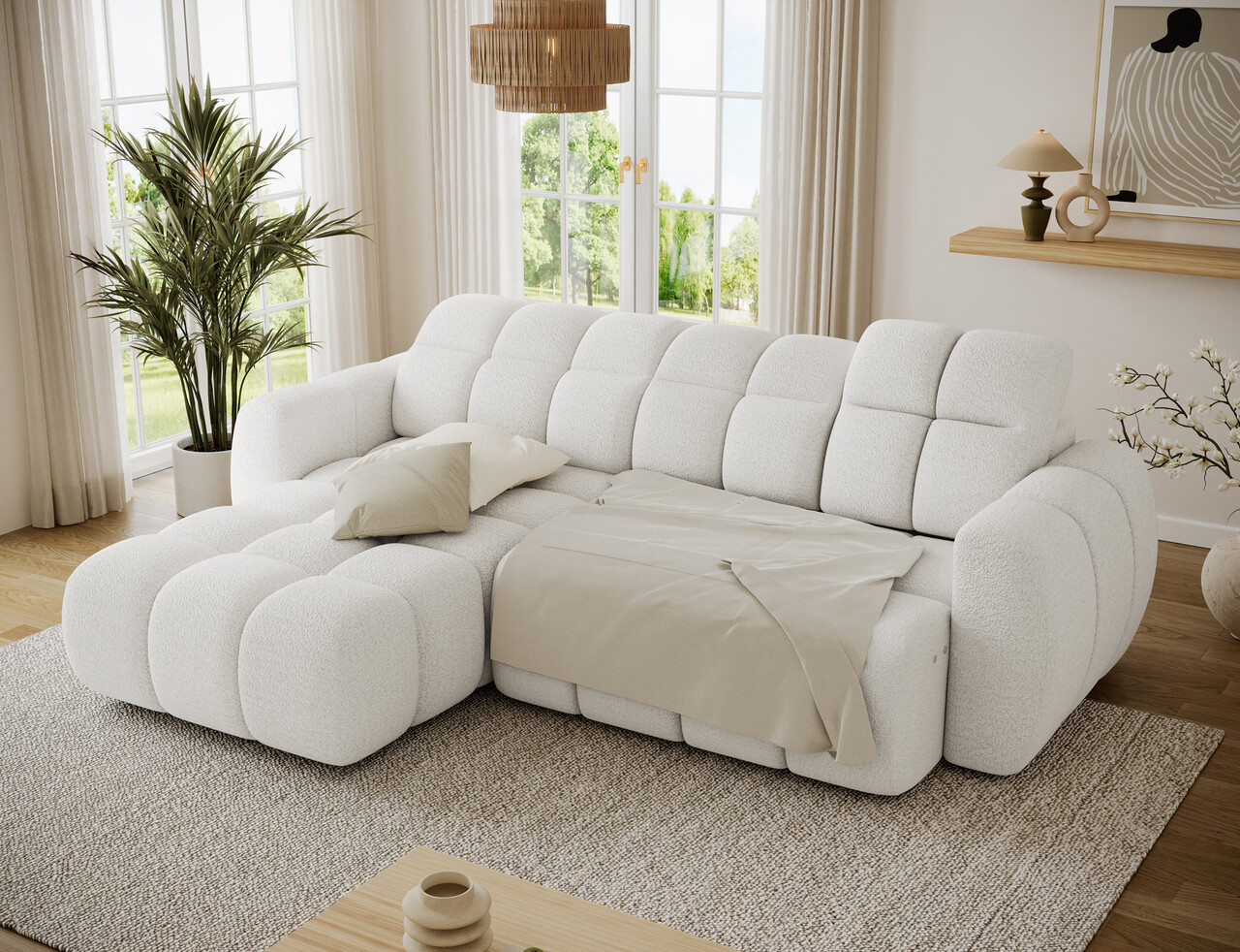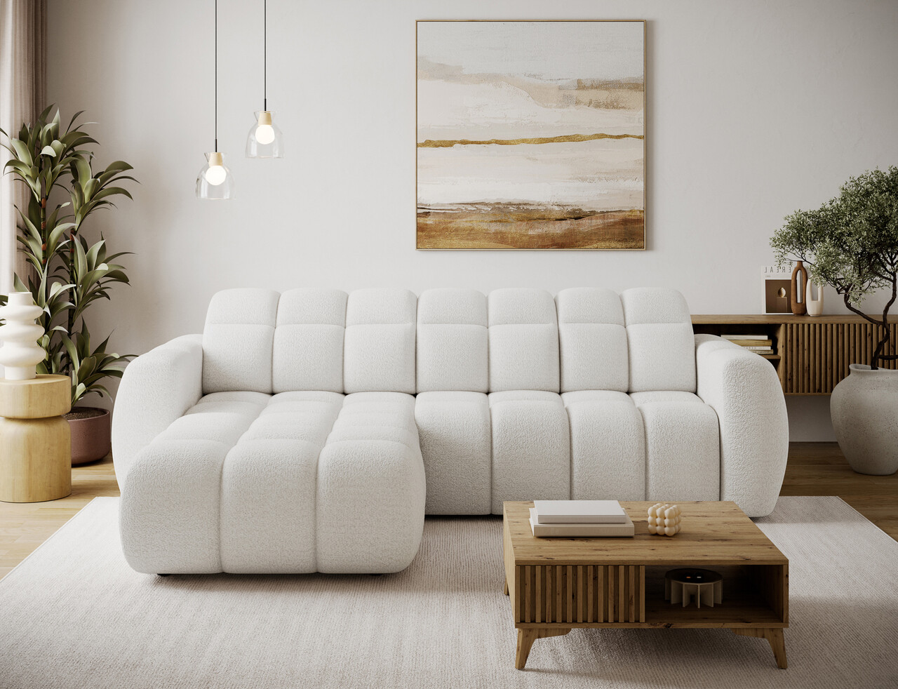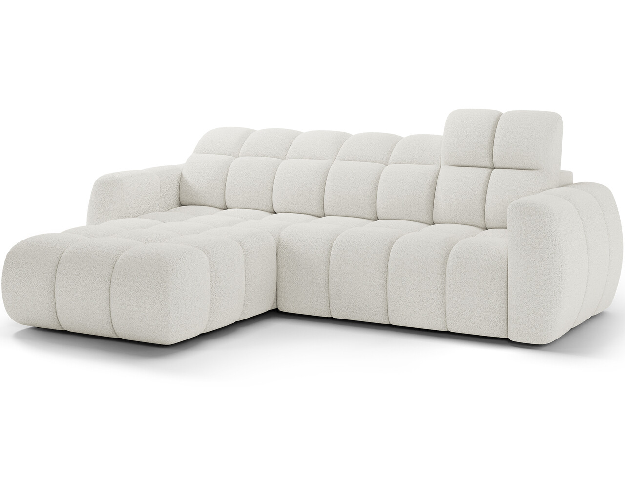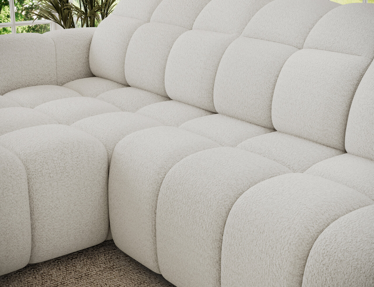 Coltarul extensibil stânga 3 locuri ELTAP Fanito 288x200x105 cm este o canapea modernă, spațioasă, ideală pentru zona de relaxare din living. Cu o siluetă impunătoare și rotunjită, acest coltar oferă un confort deosebit datorită umpluturii din arcuri ondulate tip B, spumă HR3030 și vatelină matlasată. Spătarul ergonomic, întărit cu spumă poliuretanică profilată, asigură un suport optim pentru spate. Funcția de dormit este ușor de folosit, extensia electrică de 28 cm mărind rapid spațiul de relaxare. Mecanismul tetierei permite ajustarea ușoară a sprijinului pentru cap. Finisajele din poliester alb și detaliile din lemn de pin completează designul elegant al coltarului Fanito.