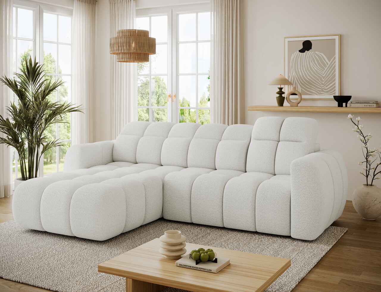 Coltar extensibil stanga 3 locuri ELTAP Fanito 288x200x105 cm lemn/poliester alb