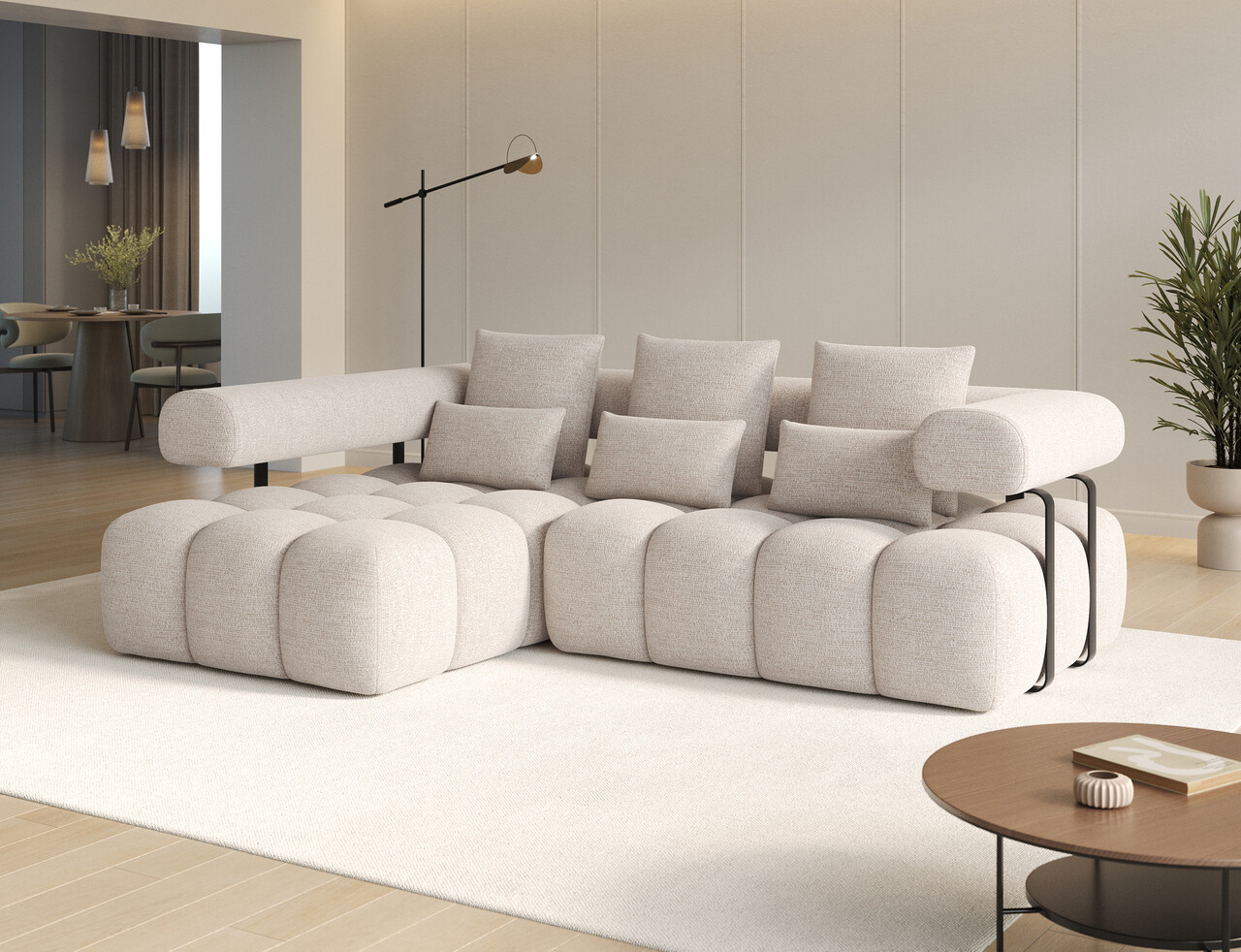 Coltarul extensibil stânga ELTAP Levvi combină modernitatea cu funcționalitatea, fiind ideal pentru orice locuință. Cu dimensiuni de 260x184x102 cm, acesta dispune de un sistem de arcuri ondulate de tip B și spumă de înaltă rezistență HR3030, oferind un suport optim și durabilitate. Funcția de transformare rapidă în pat asigură confortul oaspeților, iar spătarul complet tapițat permite amplasarea liberă în cameră. Picioarele din plastic negru subliniază stilul minimalist al coltarului. Cu 6 perne decorative incluse, Levvi îmbină eleganța cu practicitatea, având o greutate maximă suportată de 250 kg. Produsul necesită asamblare.