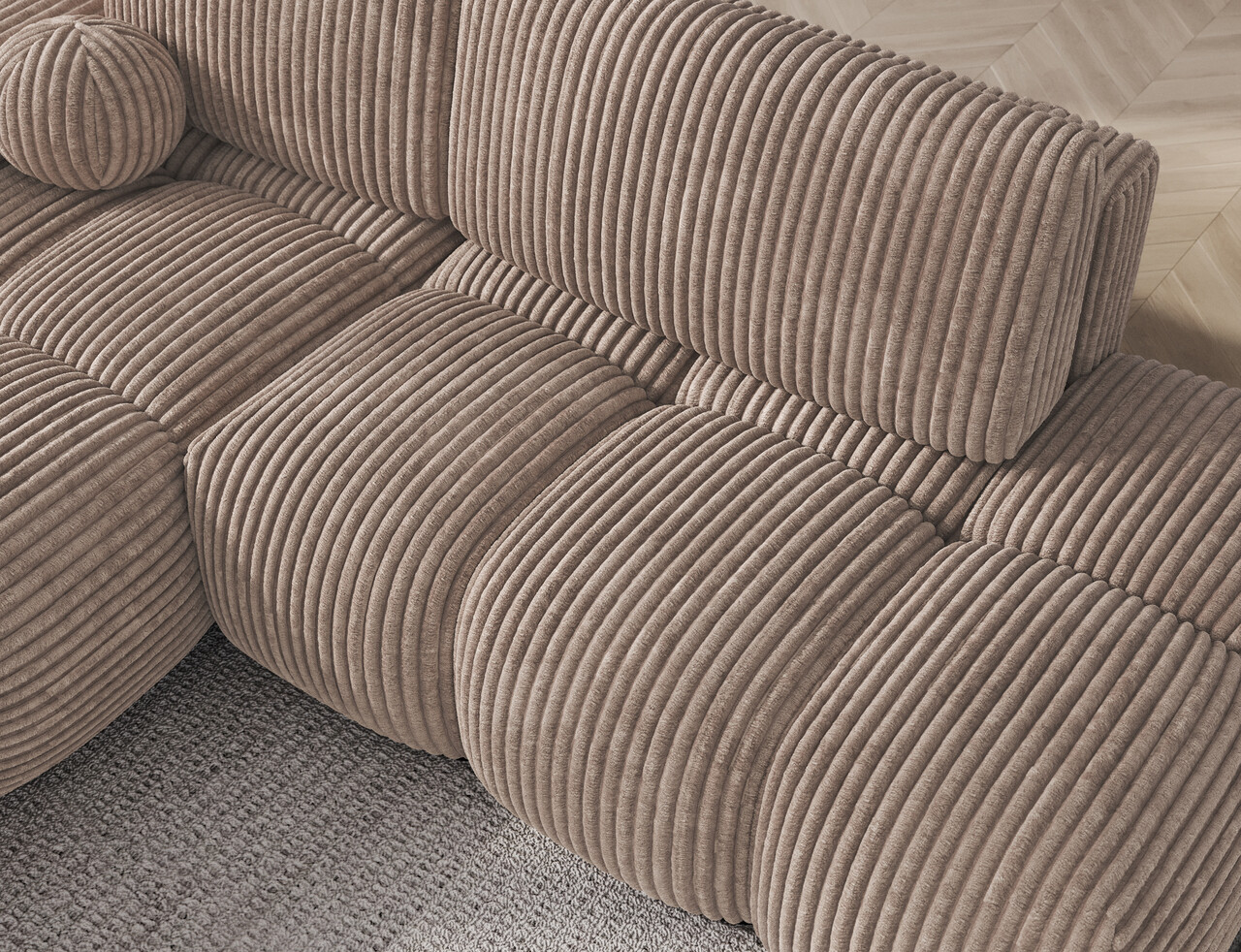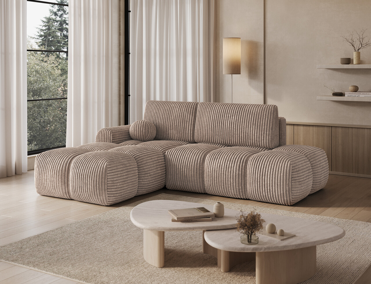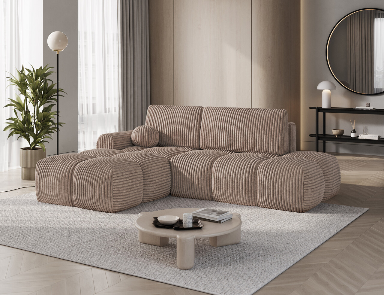 Coltarul extensibil ELTAP Vittario îmbină modernitatea cu funcționalitatea, oferind un confort exceptional. Cu dimensiuni de 227x170x95 cm, acest coltar are o formă cubică și linii moi, ideale pentru orice interior contemporan. Umplutura din arc ondulat de tip B, împreună cu spuma HR3030 și T2315, asigură un sezut plăcut, iar pernele spatelui, umplute cu granule de spumă, se adaptează corpului. Coltarul dispune de un mecanism de extensie ușor, transformându-se rapid într-un pat, și oferă o ladă de depozitare practică. Picioarele din plastic negru completează designul elegant.