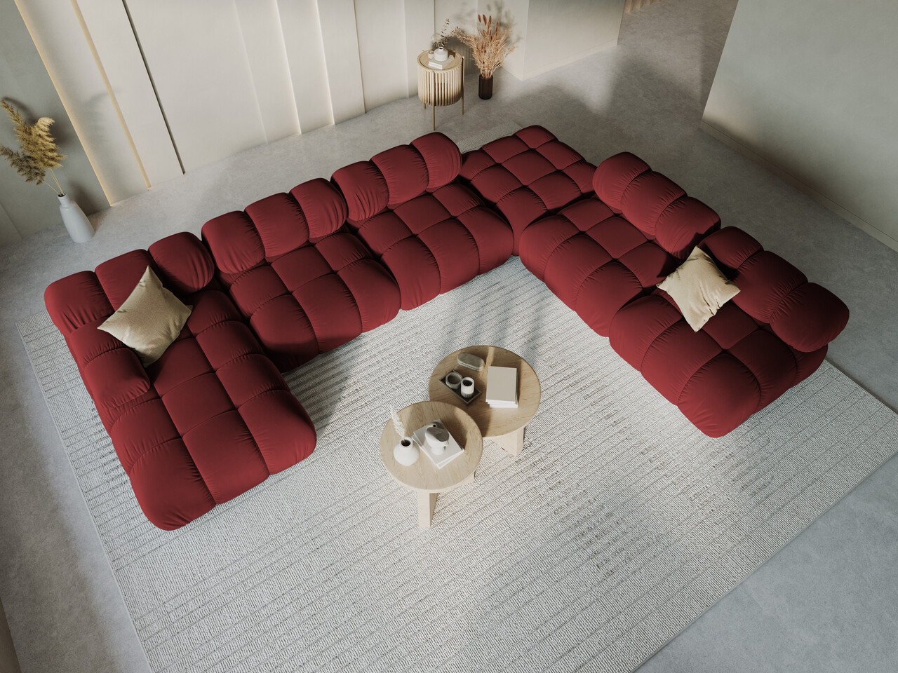 Coltar panoramic dreapta 7 locuri design modular Bellis Micadoni Home BL 379x282x63 cm catifea rosu inchis