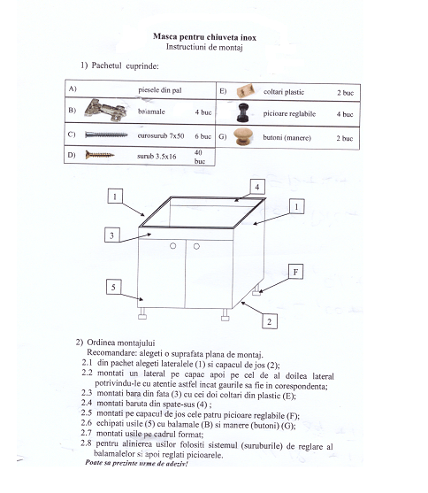 /nRecomandam prinderea chiuvetei pe masca cu silicon s-au banda dublu adeziva/nPachetul vine complet de la producator/nMasca este confectionata din PAL, are doua usi si 4 picioare reglabile pe inaltime./nSe livreaza neasamblata, cu accesorii de montare./nFabricata din PAL Melaminat cu grosimea de 18 mm picioare din plastic reglabile pentru suprafete denivelate cu inaltimea de 100 mm./nCorpul nu are inclus si blatul. /nCARACTERISTICI GENERALE                                                                                                                 /nTip produs/n Corp inferior/n Utilizat pentru/n Bucatarie/n Stil/n Clasic/n Numar corpuri mobilier/set                                            /n 1/n Numar usi/n 2/n Finisaj/n Laminat/n  /n  /n  /nChiuveta  este produsa din otel inoxidabil alimentar, de calitate premium, cu un continut de 18/10 crom-nichel, ceea ce ii ofera un aspect stralucitor si totodata, rezistenta la patare, rugina si coroziune./n/nPe langa materialul foarte rezistent, cu grosime de 0,5mm, chiuveta  este foarte practica datorita dimensiunii generoase a cuvei, a valvei de scurgere de 5 cm ce asigura o drenare mai eficienta decat in cazul unei valve mici./n/nToate aceste calitati fac din chiuveta alegerea potrivita pentru dumneavoastra./nCARACTERISTICI GENERALE BATERIE/nTip baterie/n Chiuveta bucatarie/n Tip comanda/n Monocomanda/n Stil/n Standard/n Tip pipa/n Fixa/n Material/n Otel/n Finisaj/n Cromat/n Culoare/n Argintiu/n /n Continut pachet                          /n /n 1 baterie+Sistem de fixare EASY FIX+2 racorduri flexibile/n TEAVA SCURGERE /nPentru conectarea la sistemul de canalizare/n Material: polietilena Lungime reglabila intre 400 mm – 850 mm Conexiune 1,1/2 x 40/50 mm/n Furtun flexibil Piulita de plastic 1,1/2  Garnitura/nVENTIL SI SITA METALICA /nDimensiunea filetului pentru racordarea sifonului 1,1/2 /n Material - polipropilena Norme EN 274/n Sifon chiuveta/n Dop PVC/n Gratar din otel inoxidabil/n
