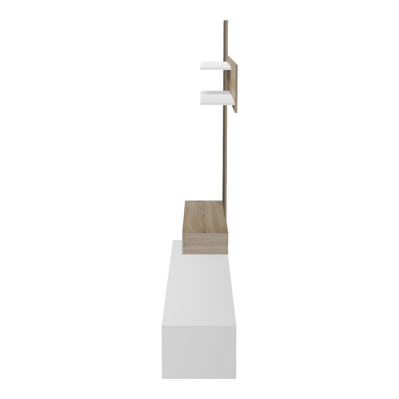 Ansamblul comoda TV Litende, cu dimensiunile de 249.4 x 42.2 x 199.5 cm, aduce eleganță și funcționalitate în livingul tău. Fabricată din lemn PAL melaminat și MDF de calitate superioară, această comoda are un design minimalist, cu o combinație de culori alb și sonoma, perfectă pentru orice decor. Dispune de două rafturi suspendate ajustabile, ideale pentru aranjamente decorative, și spații de depozitare închise pentru a menține ordinea. Se livrează dezasamblată, cu instrucțiuni clare și accesorii necesare montajului. Transformă-ți livingul cu acest element deosebit!