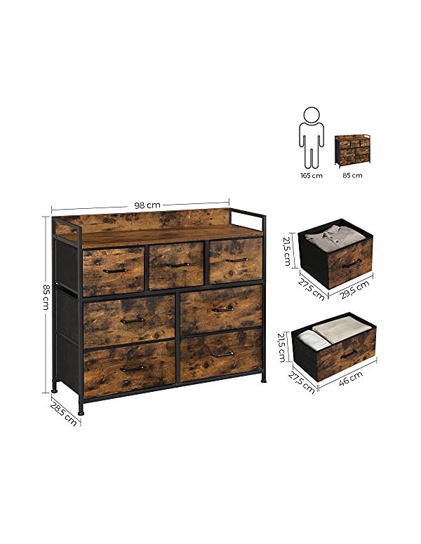 Îmbogățește-ți spațiul cu comoda Vasagle, un element de mobilier practic și elegant. Cu un design rustic în nuanțe de maro, această comoda măsoară 98 x 28.5 x 85 cm și este realizată din MDF de calitate superioară. Dispune de 7 sertare, dintre care 5 sunt mari (46 x 27.5 x 21.5 cm) și 2 mici (29.5 x 27.5 x 21.5 cm), oferind ample opțiuni de depozitare. Greutatea de 12.5 kg o face ușor de manevrat, iar pachetul include tot ce ai nevoie pentru asamblare. Transformă-ți casa cu stil și funcționalitate datorită acestei comode versatile!