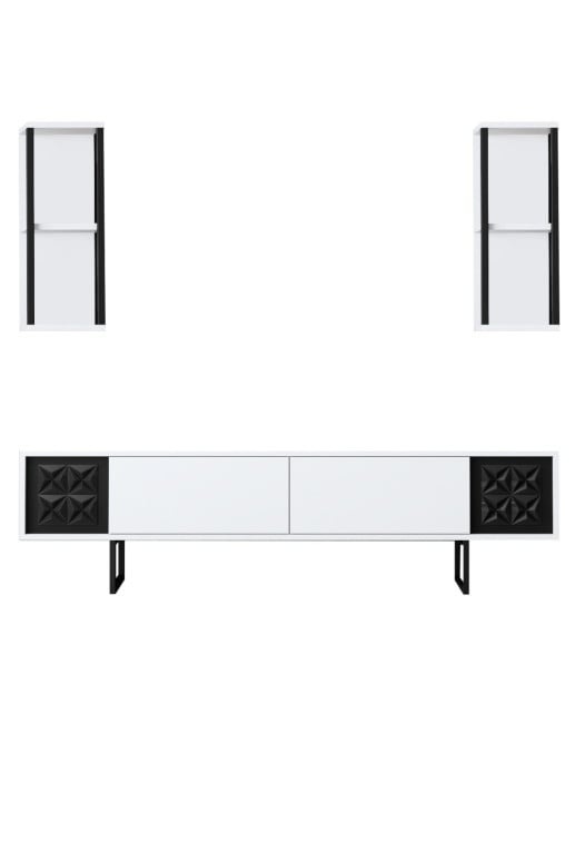 Comodă TV Black Alb-Negru de la brandul Salvador este realizată din 100% PAL melaminat, cu o grosime de 18 mm, asigurându-se astfel durabilitate și rezistență. Picioarele din metal, cu o înălțime de 18 cm, conferă un aspect modern și elegant. Comoda are dimensiuni generoase, având o lățime de 180 cm, adâncime de 30 cm și înălțime de 48 cm, oferind suficient spațiu pentru echipamentele electronice. De asemenea, rafturile de perete, cu lățimi de 22 cm și adâncimi de 21 cm, completează designul, aducând un plus de stil și funcționalitate.