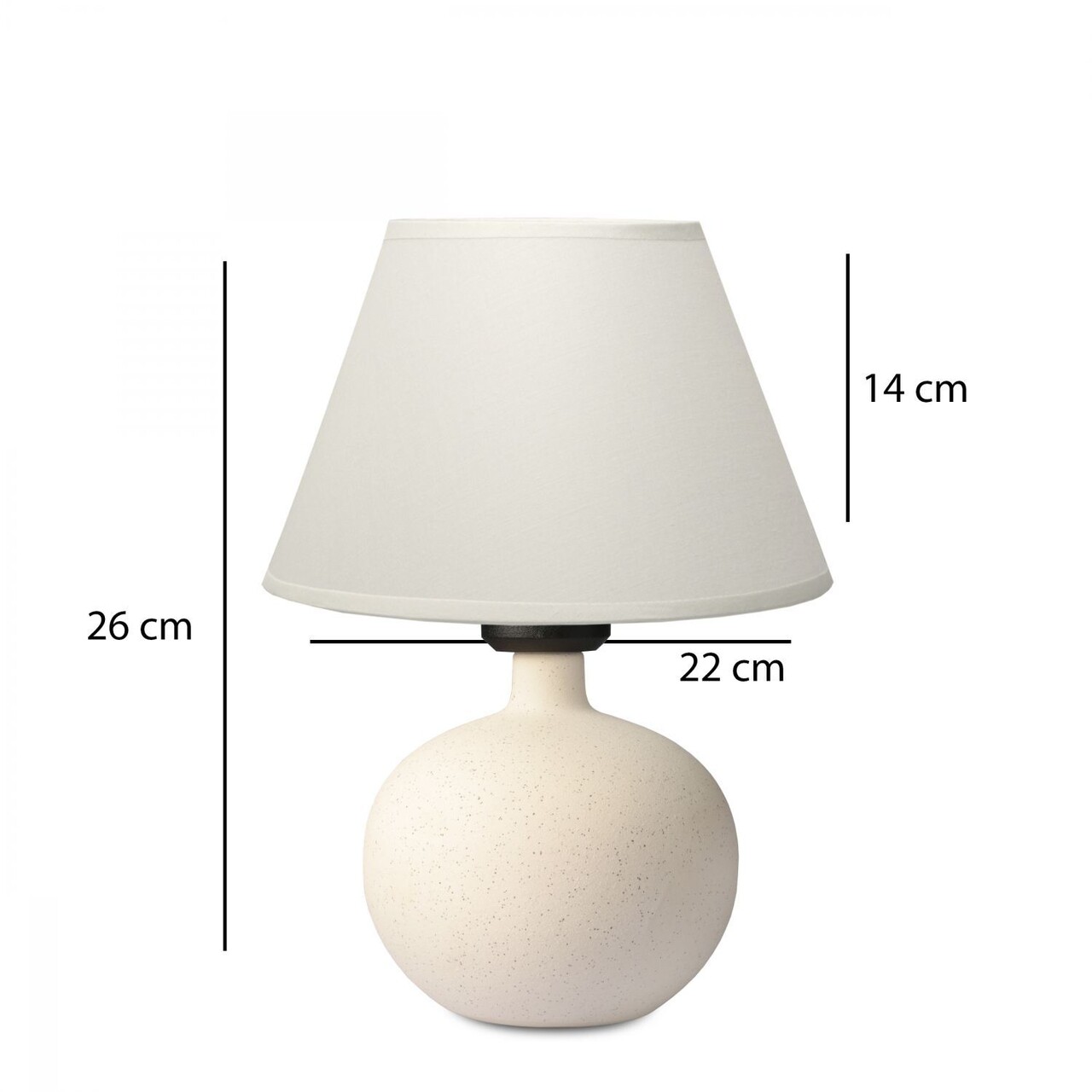 Lampa de masaAbajul din material textilDimensiunea capacului: Ø22 h:14 cmLungimea cablului: 150 cmInaltime totala: 26 cmTip soclu: 1 x E 27 Max 40 WBecul nu este inclus220 - 240 VGrad de protectie: IP20