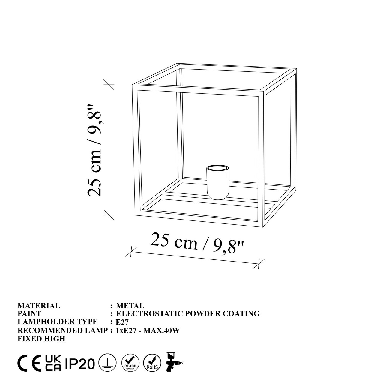 Lampa de masaMarime: 25 x 25 x 25 cmLungimea cablului: 200 cmButon de pornire/oprire pe cabluTip soclu: 1 x E 27 Max 40 WBecul nu este inclus220-240 VGrad de protectie: IP20