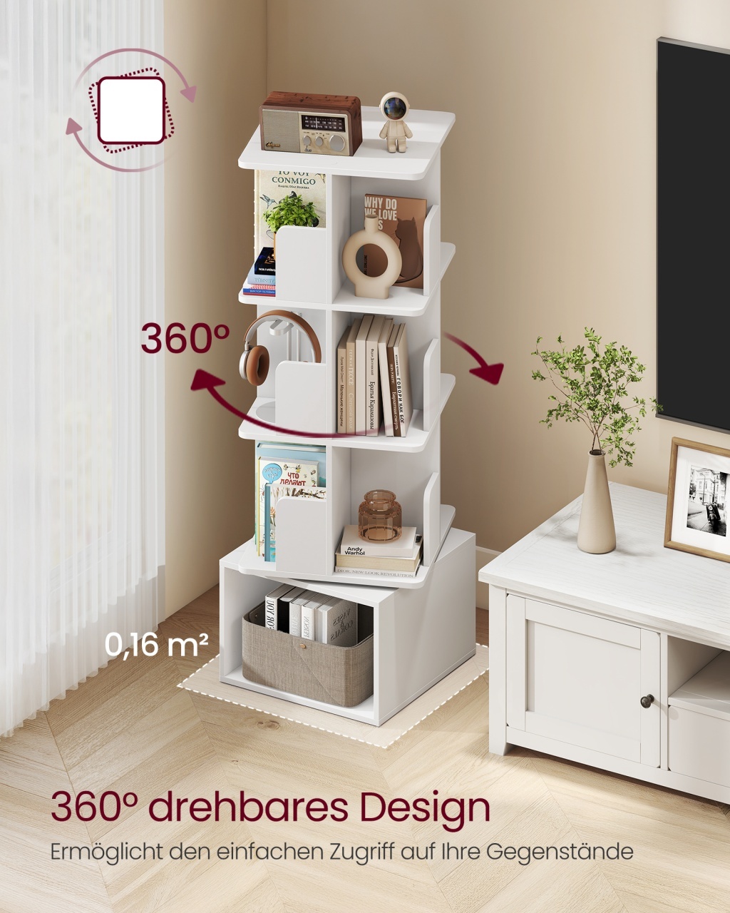 Bibliotecă rotativă Albă 40 x 40 x 124,6 cm — Organizare compactă și acces 360° Design și materiale de calitate Formă curată, prezență caldă: această bibliotecă rotativă aduce un aer relaxant și discret în living sau dormitor, cu un finisaj cloud white ce luminează colțul în care o poziționezi. Construcția combină Lemn PAL (plăci aglomerate) și Lemn MDF (fibra de densitate medie) pentru un echilibru ideal între rezistență și aspect estetic, iar suprafața este tratată pentru a fi rezistentă la zgârieturi și hidrofugă. Accent pe minimalism , funcționalitate și calitate . Funcționalitate și organizare Designul cu compartimente deschise oferă vizibilitate imediată și acces facil: 4 nivele rotative cu compartimente ideale pentru cărți, CD-uri sau decorațiuni. Rotirea la 360° înseamnă că totul este la îndemână, iar spațiul vertical este folosit eficient, fără amprenta la sol a unei biblioteci tradiționale. Dimensiuni esențiale: 40 x 40 x 124,6 cm (L x l x H) și compartimentul de bază de 40 x 37,4 x 26 cm , capacitate pe nivel 10 kg și capacitate totală 40 kg . Elemente cheie: spațiu deschis , compartimente și optimizare verticală . Montaj și întreținere Produs livrat neasamblat, cu instrucțiuni clare și accesorii incluse pentru montaj. Curățarea este simplă: folosește o lavetă moale pentru a păstra suprafața ca nouă. Pachetul conține și un kit anti-răsturnare (tilt protection) pentru stabilitate sporită și liniște sufletească în utilizare. Recomandăm montajul atent pentru a asigura funcționarea optimă a sistemului rotativ. Cuvinte cheie: curățare ușoară , montaj , kit anti-răsturnare . Comandă acum și transformă-ți spațiul! Alege o soluție inteligentă pentru organizare: adaugă această bibliotecă rotativă albă în coș și dă viață rafturilor tale cu stil și acces instant. Perfectă pentru un living aerisit și o colecție de cărți ordonată. Detalii tehnice complete Dimensiuni și greutate Dimensiuni produs: 40 x 40 x 124,6 cm Greutate produs: 19.6 kg Capacitate maximă de susținere: 40 kg Materiale și caracteristici Material corp: Lemn PAL, Lemn MDF Material finisaj/tapițerie: Finisaj rezistent la zgârieturi și hidrofug Culoare: Alb Număr pachete: 1 Montaj și pachet Stare asamblare: Neasamblat Conținut pachet: 1 x Bibliotecă, Accesorii de montaj, Instrucțiuni, 1 x Kit anti-răsturnare Stil și origine Stil: Minimalist Destinație recomandată: Living