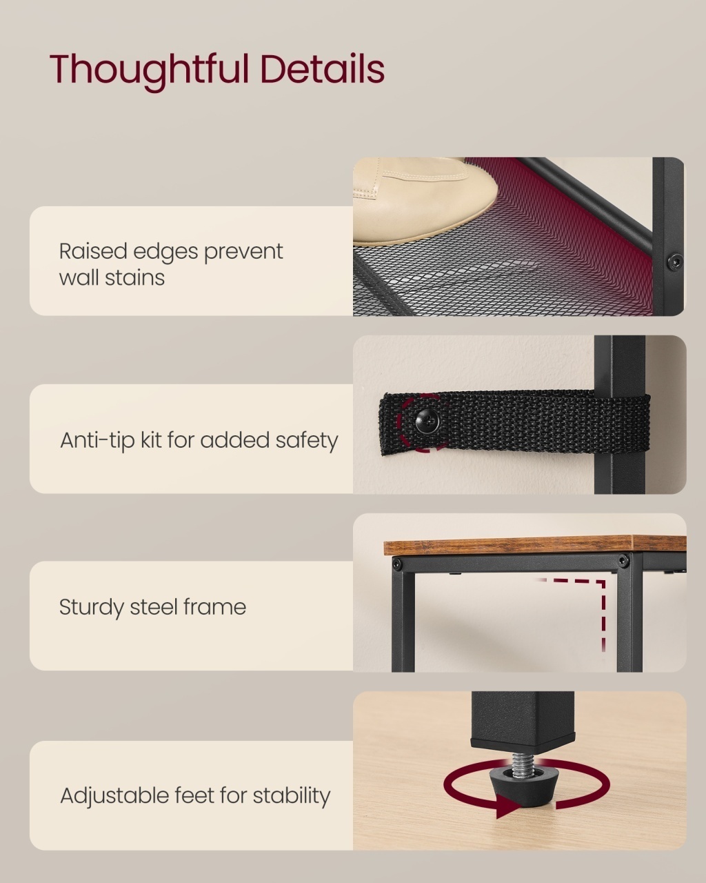 Pantofar Vasagle 76x28x114 cm — Organizare cu stil Design modern și materiale de calitate Construit cu atenție la detalii, acest pantofar îmbină estetica industrială cu o prezență caldă datorită finisajului maro și accentei negre, astfel încât să îți transforme holul într-o zonă cu adevărat rafinată. Materialele au fost alese pentru a oferi atât rezistență, cât și farmec vizual: structura robustă din oțel susține liniile curate, iar suprafețele din PAL conferă o senzație plăcută la atingere. Rezultatul este un corp de mobilier care adaugă durabilitate , estetică și rafinament spațiului tău. Funcționalitate și organizare Cu cele șase niveluri reglabile, pantofarul optimizează spațiul și îți permite să aranjezi încălțămintea în funcție de tipuri și preferințe, astfel economisind timp și energie în fiecare zi. Marginile ridicate protejează pereții și mențin totul curat, iar rafturile sunt suficient de încăpătoare pentru a găzdui atât pantofi, cât și genți sau elemente decorative, oferind o soluție versatilă pentru antreu. Prin această structură, produsul organizează, protejează și aduce versatilitate , spațios și optimizare în fluxul tău zilnic. Montaj și întreținere Asamblarea se realizează rapid datorită pieselor etichetate clar și instrucțiunilor simple, astfel încât să te bucuri de ordine din prima zi; în plus, pentru siguranță, produsul trebuie fixat în perete cu kitul anti-răsturnare inclus. Întreținerea este la fel de facilă: șterge suprafețele din PAL cu o cârpă ușor umedă și usucă rapid componentele metalice pentru a păstra aspectul original, ceea ce prelungește durabilitatea și calitatea mobilierului. Pentru liniștea ta, respectă recomandările de încărcare și asigurare, garantând astfel siguranță și stabilitate . Comandă acum Adaugă ordine și rafinament holului tău — comandă pantofarul Vasagle și transformă fiecare intrare într-un spațiu organizat și primitor. Detalii tehnice complete Dimensiuni și greutate Dimensiuni produs: 76 x 28 x 114 cm Greutate produs: 7.47 kg Capacitate maximă: Etaj superior: 27 kg; Fiecare poliță: 11 kg Materiale și caracteristici Material corp: PAL melaminat și structură din oțel Culoare: Maro și Negru Număr pachete: 1 Montaj și pachet Stare asamblare: Neasamblat Conținut pachet: 1 x Pantofar, 1 x Kit anti-răsturnare Stil și origine Stil: Industrial Destinație recomandată: Hol / Antreu Informații importante Produsul trebuie fixat obligatoriu în perete cu kitul anti-răsturnare inclus pentru a preveni accidentele; astfel asiguri stabilitate și protecție, în special în preajma copiilor. Nu depăși capacitățile maxime recomandate pentru fiecare poliță și pentru etajul superior, deoarece încărcarea excesivă poate compromite stabilitatea și integritatea structurii. Respectă instrucțiunile de montaj și întreținere pentru a păstra aspectul și funcționalitatea pe termen lung.