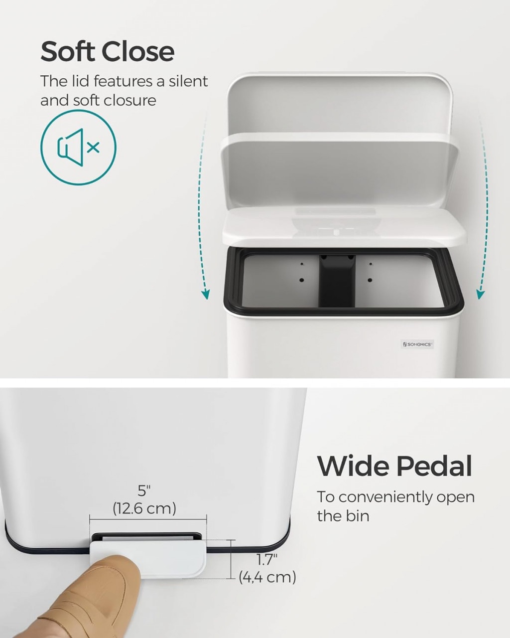 Cosul de gunoi Songmics Alb, cu dimensiunile de 34.5×32×59.5 cm, este alegerea ideală pentru orice bucătărie. Datorită sistemului Soft Close, capacul se închide lent și silențios, prevenind închiderea bruscă. Fabricat din oțel de înaltă calitate, este rezistent la rugină și ușor de curățat. Capacul poate fi menținut deschis în timpul gătitului, iar inelul de prindere asigură că sacul de gunoi rămâne fixat și nu este vizibil. Fără o găleată interioară, acest cos oferă cu 20% mai mult spațiu pentru deșeuri. În plus, include 15 piese de gunoi potrivite pentru utilizare imediată.