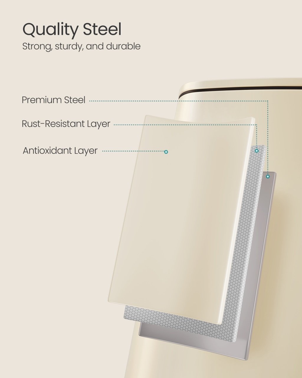 Coș de gunoi Songmics 30 L — Organizare compactă cu rafinament Design modern și materiale de calitate Construit din oțel rezistent și finisat într-o nuanță caldă de bej nisip, acest coș de gunoi conferă bucătăriei tale o notă de rafinament și eleganță discretă, potrivită pentru interioare moderne. suprafața netedă, rezistentă la coroziune, și liniile clare ale corpului se îmbină pentru a crea o estetică plăcută, care nu compromite durabilitatea sau funcționalitatea. Datorită dimensiunilor inteligente, designul rămâne premium și potrivit pentru spații compacte fără a sacrifica capacitatea utilă. Funcționalitate și organizare Acest coș de gunoi transformă rutina zilnică prin mecanisme inteligente: capac cu închidere silențioasă (soft-close) și funcție de blocare în poziție deschisă pentru momentele în care ai nevoie de acces facil și rapid. Datorită coșului interior detașabil cu mânere, gestionarea sacilor și curățenia devin simple, astfel încât spațiul tău rămâne ordonat și protejat de resturi. Cu ajutorul pad-urilor antiderapante, produsul rămâne stabil și pet-proof, oferind o combinație excelentă de organizare, versatilitate și optimizare a spațiului. Montaj și întreținere Produsul vine gata pentru utilizare imediată și nu necesită asamblare complexă, astfel încât îl poți integra rapid în orice încăpere; întreținerea este la fel de simplă, deoarece suprafețele din oțel se curăță ușor cu o cârpă moale și un detergent blând. Pentru o durabilitate pe termen lung, evită expunerea la umezeală prelungită și ține produsul în interior, conform recomandărilor producătorului, ceea ce asigură durabilitate și siguranță. Caracteristicile de stabilitate și designul practic conferă o ușurință în utilizare care transformă gestionarea deșeurilor într-o experiență fluidă și lipsită de griji. Comandă acum Alege eleganța practică pentru bucătăria ta — comandă Coșul de gunoi Songmics și optimizează spațiul cu stil. Detalii tehnice complete Dimensiuni și greutate Dimensiuni produs: 34 x 28.5 x 54.4 cm Greutate produs: 3.2 kg Capacitate maximă: 30 L Materiale și caracteristici Material corp: Oțel și PP (polipropilenă) Culoare: Bej nisip Număr pachete: 1 Montaj și pachet Stare asamblare: Neasamblat Conținut pachet: 1 x Coș de gunoi Stil și origine Stil: Modern Destinație recomandată: Bucătărie, Hol, Birou Informații importante Acest coș de gunoi este destinat exclusiv utilizării în interior. Pentru întreținere, șterge suprafețele cu o cârpă moale și ușor umedă; dacă este necesar, folosește un detergent blând pentru a păstra finisajul. Coșul interior detașabil facilitează schimbarea sacilor și curățarea, iar pad-urile antiderapante reduc riscul de răsturnare, menținând zona ordonată și sigură.