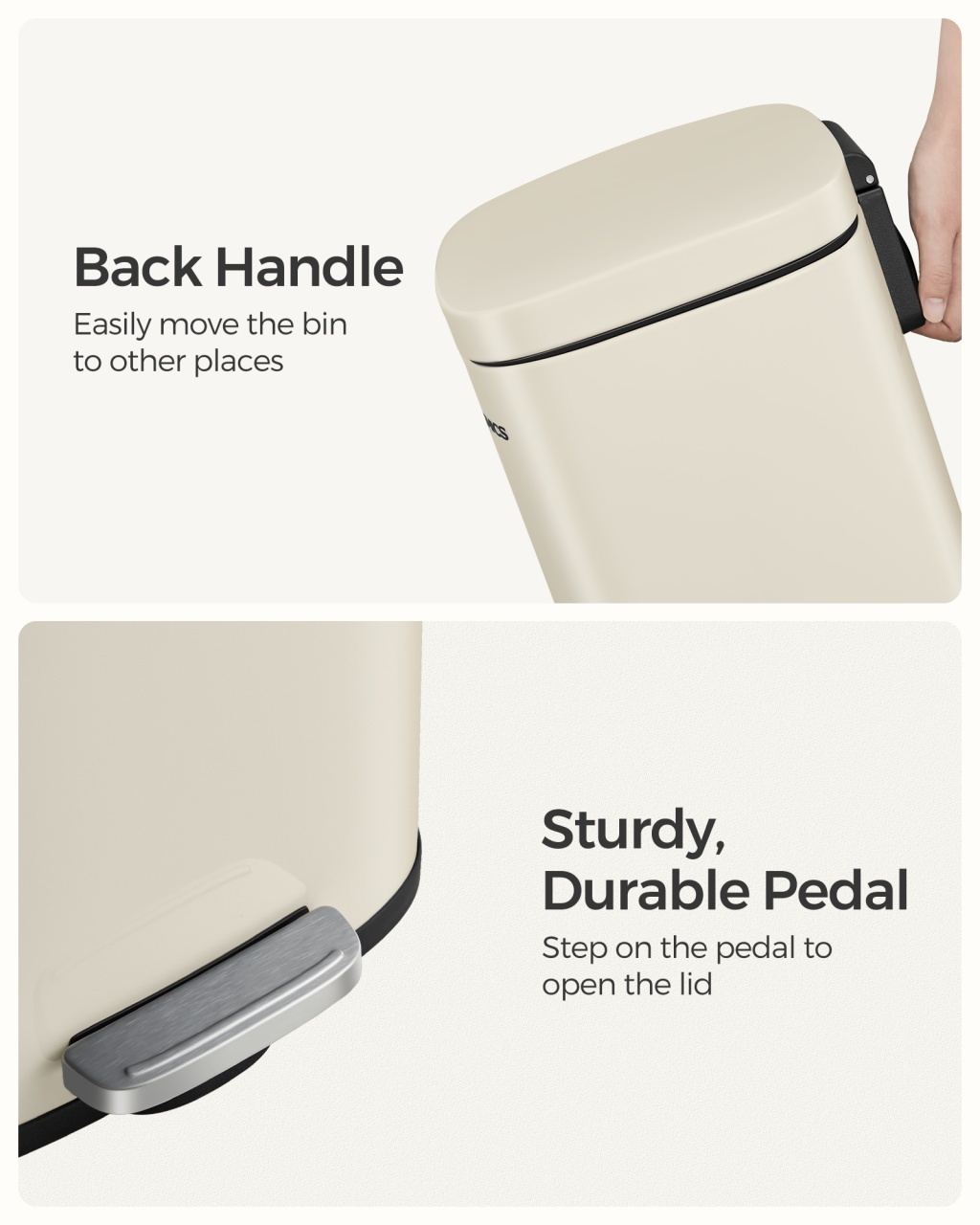 Coș de gunoi Songmics 34.8x29.7x63.3 cm — Economisește spațiu și păstrează aerul proaspăt Design modern și materiale de calitate Acest coș de gunoi se remarcă printr-un design modern și o cromatică bej nisipiu care aduce rafinament și continuitate estetică în bucătărie sau la birou, astfel încât să completeze cu grație orice decor contemporan. Construit din oțel de calitate și prevăzut cu o găleată interioară din PP , produsul îmbină durabilitate și finisaje plăcute la atingere, conferind o senzație premium la fiecare utilizare. Datorită liniilor curate și proporțiilor compacte, coșul devine un element discret, dar totodată elegant, în ambianța ta. Funcționalitate și organizare Proiectat pentru a optimiza spațiul fără a sacrifica capacitatea, coșul cu volum de 30 L organizează eficient deșeurile zilnice, astfel încât bucătăria sau biroul tău să rămână curate și ordonate. Capacitatea generoasă și găleata interioară facilitează fixarea sacilor menajeri, în timp ce mecanismul cu închidere lentă ( soft-close ) asigură o funcționare silencioasă și blochează mirosurile, păstrând o atmosferă proaspătă în locuință. Accesul dual, prin pedala pentru utilizare hands-free sau prin ridicarea manuală a capacului, oferă versatilitate și confort în fiecare moment al zilei, iar mânerul posterior permite o mutare ușoară și rapidă. Montaj și întreținere Montajul este practic inexistent, deoarece produsul este livrat complet, iar utilizarea nu necesită operațiuni complicate; totuși, pentru siguranță plasează-l pe o suprafață plană și stabilă, astfel încât să previi eventuale răsturnări. Curățarea este simplă și rapidă datorită corpului din oțel care se întreține ușor cu o cârpă umedă, iar găleata interioară din PP se poate scoate pentru golire și igienizare, sporind igiena și durabilitatea produsului. Pentru a menține siguranța familiei tale, utilizează capacul conform instrucțiunilor și evită forțarea manuală a închiderii, protejând astfel mecanismul soft-close și funcționalitatea pe termen lung. Comandă acum Transformă-ți rutina zilnică cu un coș practic și elegant — comandă acum pentru o bucătărie mai ordonată și mai liniștită. Detalii tehnice complete Dimensiuni și greutate Dimensiuni produs: 34.8 x 29.7 x 63.3 cm Greutate produs: 3.8 kg Capacitate maximă: 30 L Materiale și caracteristici Material corp: Oțel și găleată interioară din PP Culoare: Bej nisipiu Număr pachete: 1 Montaj și pachet Stare asamblare: Neasamblat Conținut pachet: 1 x Coș de gunoi Songmics (inclusiv găleată interioară din PP) Stil și origine Stil: Modern Destinație recomandată: Bucătărie, Birou (utilizare în interior) Informații importante Produsul este destinat utilizării exclusiv în interior; evită utilizarea în mediul exterior pentru a preveni coroziunea sau deteriorarea. Nu forța închiderea capacului cu mâna, deoarece acest lucru poate afecta mecanismul de închidere lentă și siguranța generală a produsului. Respectă recomandările de curățare pentru a menține îndeplinearea funcțiilor de etanșare și neutralizare a mirosurilor.