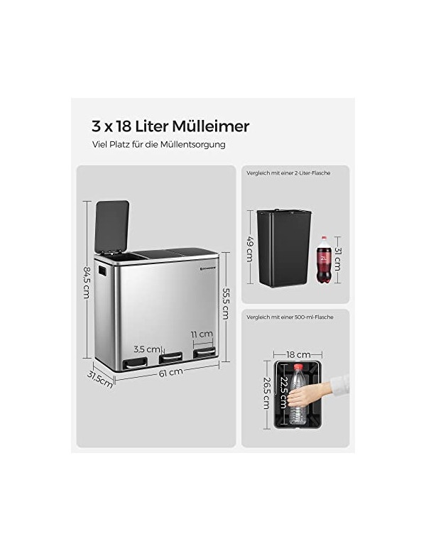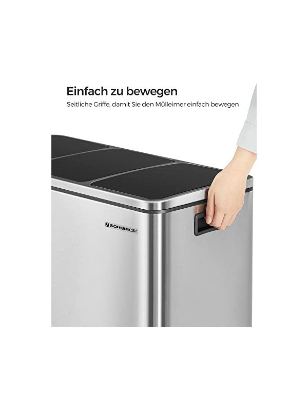 Coșul de reciclare Songmics LTB54NL este soluția ideală pentru organizarea eficientă a deșeurilor. Cu trei compartimente, fiecare având o capacitate de 18 litri, acest coș facilitează sortarea reciclabilor. Fabricat din metal și plastic, are un design modern, disponibil în culori argintii și negre. Dimensiunile totale sunt de 61.5 x 31.5 x 56 cm, iar greutatea de 9.1 kg asigură stabilitate. Înălțimea cu capacul deschis atinge 84.5 cm, oferind un acces facil. Pachetul include un coș de gunoi și instrucțiuni de montaj.
