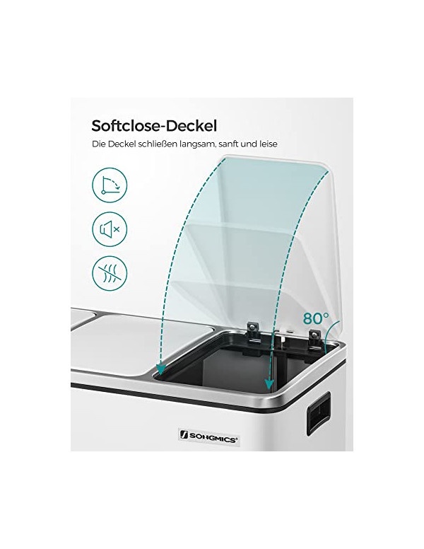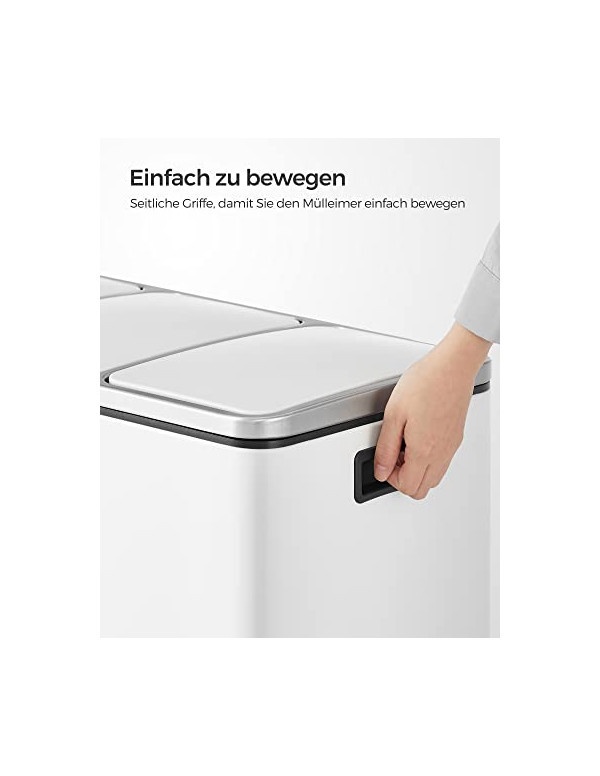 Coșul pentru reciclare Soft-Close în culoare albă, model LTB54WT, este soluția ideală pentru o gestionare eficientă a deșeurilor. Fabricat din metal și PP plastic de calitate, acesta are dimensiuni totale de 61.5 x 31.5 x 56 cm, iar fiecare compartiment are o capacitate de 18 litri, măsurând 18 x 26.5 x 49 cm. Cu o înălțime totală de 84.5 cm și o greutate de 9.1 kg, coșul este ușor de utilizat și de întreținut. În pachet veți găsi coșul de gunoi și instrucțiuni pentru montaj. Se curăță cu o cârpă umedă pentru a menține aspectul său fresh.