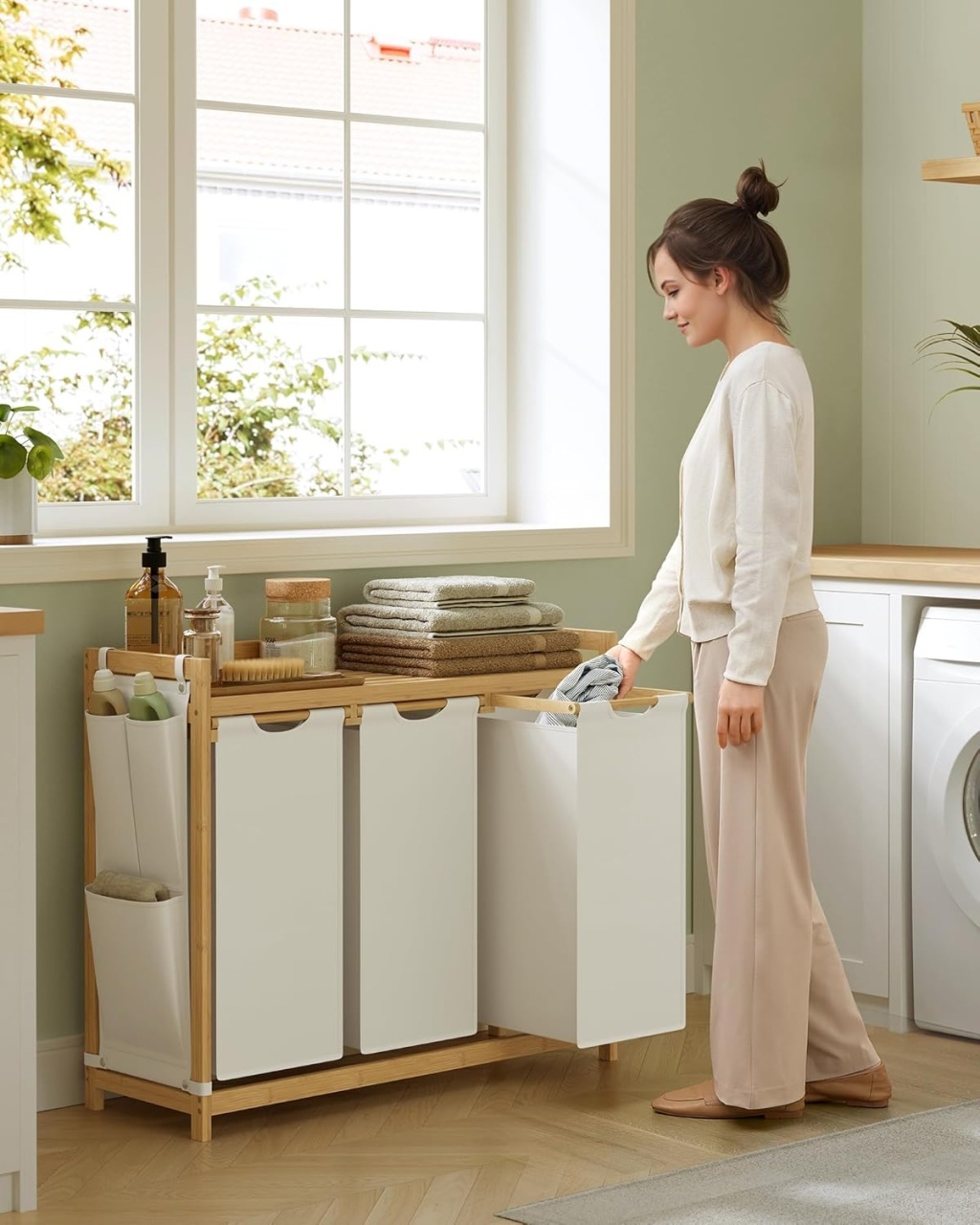 Coș de Rufe Crem Songmics - Organizare Eficientă pentru Îmbrăcăminte Descoperă coșul de rufe Crem Songmics, o soluție ideală pentru a-ți organiza rufele cu stil și eficiență. Cu o capacitate totală de 150 L, acest coș dispune de 3 compartimente care îți permit să separi rufele în funcție de tip, facilitând astfel spălarea acestora. Fie că este vorba de rufe albe, colorate sau delicate, acest coș îți va face viața mai ușoară. Design Practic și Funcțional Coșul de rufe este dotat cu un raft de depozitare situat în partea superioară, perfect pentru a păstra detergentul, plasmele de rufe și alte accesorii necesare. În plus, pochetele laterale compacte oferă un spațiu suplimentar pentru obiecte mici, astfel încât să ai totul la îndemână. Construcție Robustă și Durabilă Fabricat din bamboo de calitate superioară, acest coș de rufe este stabil și durabil, având un raft care suportă până la 24 kg. Designul său include protecții laterale pentru a preveni căderea obiectelor, asigurându-ți astfel o utilizare fără griji. Folie Ușor de Îndepărtat Fiecare compartiment este echipat cu o folie cu bază din plastic, care împiedică lăsarea în jos. Datorită sistemului de prindere cu arici, poți îndepărta cu ușurință folia pentru a o transporta la mașina de spălat, făcând procesul de spălare mai simplu și mai eficient. Estetică Naturală și Elegantă Coșul de rufe din bamboo aduce un aspect elegant și natural în orice interior, integrându-se perfect în stilul casei tale. Este o alegere excelentă pentru cei care apreciază atât funcționalitatea, cât și designul. Detalii Tehnice Culoare: Crem Material: Bamboo, Fabrică Oxford Dimensiune produs: 97.9 x 33 x 78 cm Dimensiune fiecare folii: 31 x 27 x 59 cm Greutate produs: 7.9 kg Capacitate maximă totală: 45 kg Capacitate maximă fiecare folii: 7 kg Capacitate maximă raft: 24 kg Ce Conține Pachetul 1 x Coș de rufe 1 x Kit anti-întoarcere 1 x Kit de accesorii 1 x Instrucțiuni Îmbunătățește-ți Spațiul cu Coșul de Rufe Songmics! Nu mai aștepta! Alege acum coșul de rufe Crem Songmics și transformă-ți rutina de spălare într-o experiență plăcută și organizată. Comandă acum și bucură-te de un cămin mai ordonat!