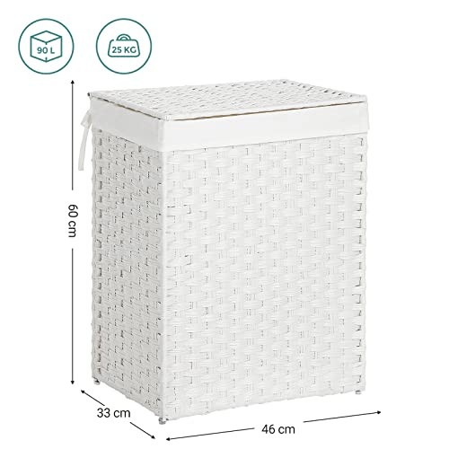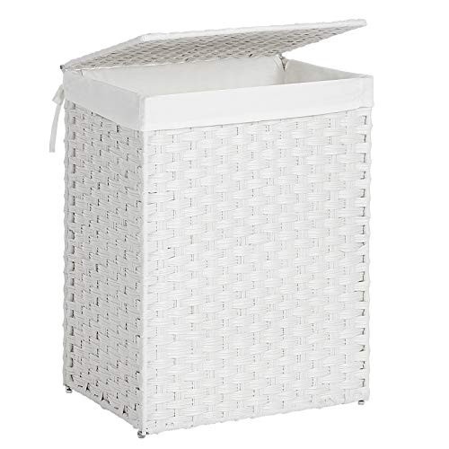 Frumusete tesuta manual: Meticulos lucrat, acest cos de rufe din ratan sintetic frumos tesut manual in alb este piesa lipsa de care aveti nevoie pentru a va ascunde hainele murdare si pentru a va pastra casa in ordine perfecta. COMPANION DE BAIE: Asezati cosul de rufe unde doriti fara griji; ratanul sintetic durabil este rezistent la apa, iar cadrul metalic stabil este rezistent la rugina, ceea ce il face un companion ideal chiar si pentru baile umede GRAB-AND-GO: Te-ai saturat sa cari cu greutate cosul de rufe vechi si greu pana la masina de spalat? Acum, puteti pur si simplu sa dezlegati sacul de captuseala de la cos si sa va plimbati cu usurinta; sau sa transportati fara efort acest cos de 90L cu capac folosind manerele laterale DETALII MICI, IMPACT MARE: Cosul de rufe poate fi asamblat in cateva minute si pliat pentru depozitare; punga de captuseala este legata de cos pentru a preveni caderea acestuia; picioarele din gel de siliciu impiedica cosul sa atinga pamantul CE OBTINETI: Un cos de rufe tesut manual, cu o captuseala detasabila si manere laterale, care functioneaza ca o modalitate de a depozita rufele departe de ochii tai sau ca o cutie de depozitare