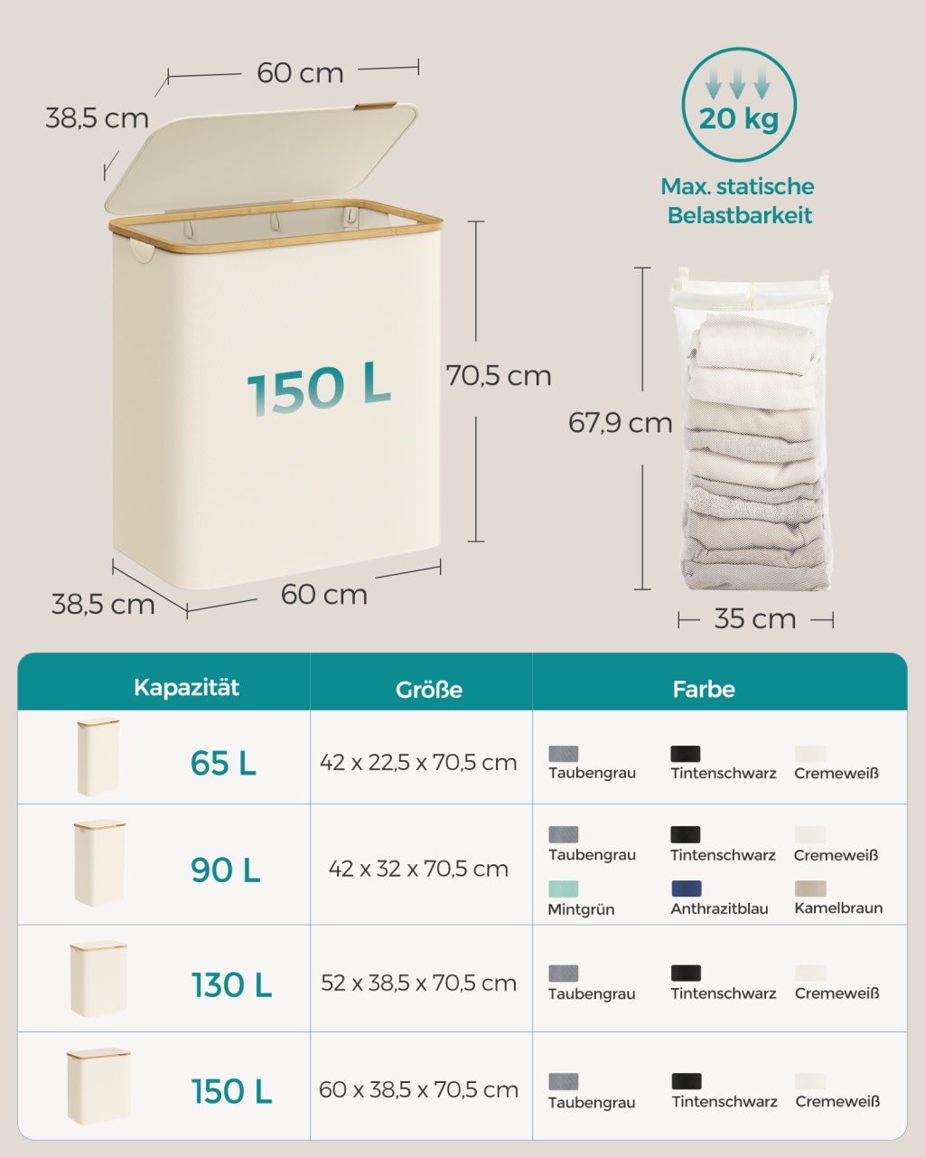 Cos de rufe Songmics Crem 60x38.5x70.5 cm